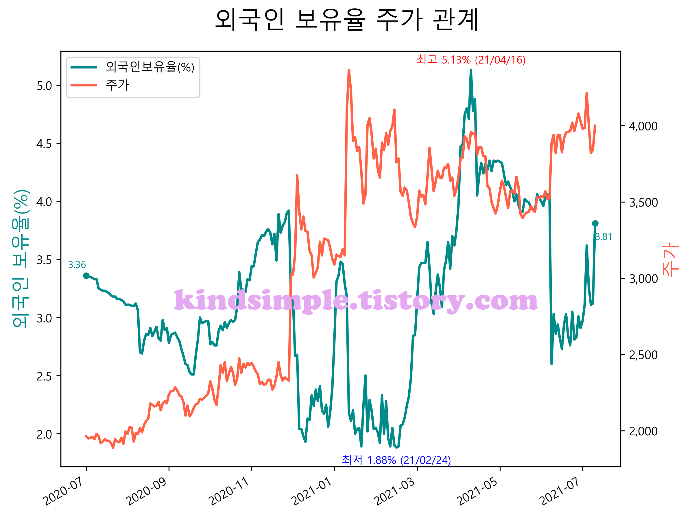 최근 1년간 외국인 보유율 및 주가와의 관계입니다.