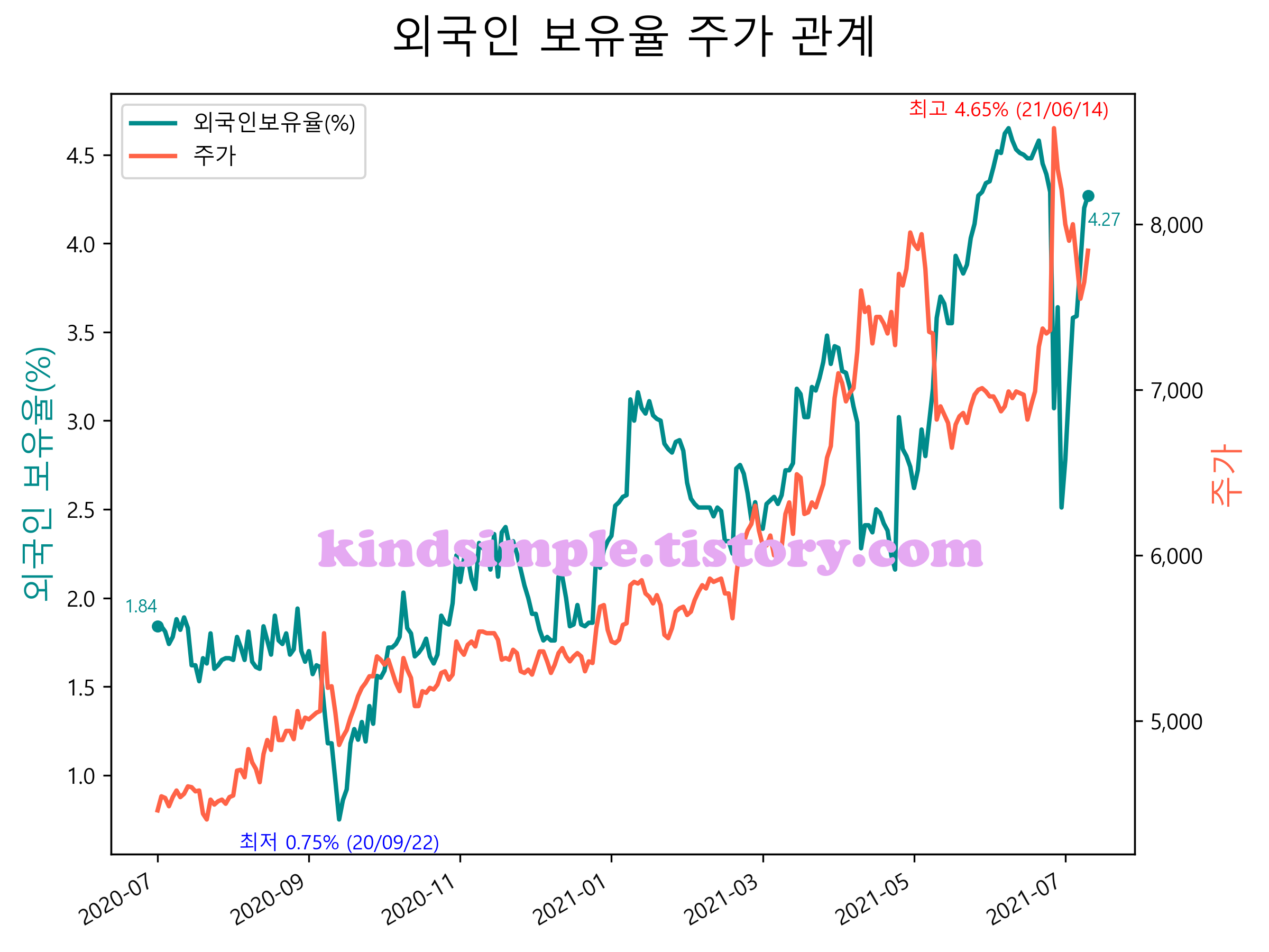 최근 1년간 외국인 보유율 및 주가와의 관계입니다.