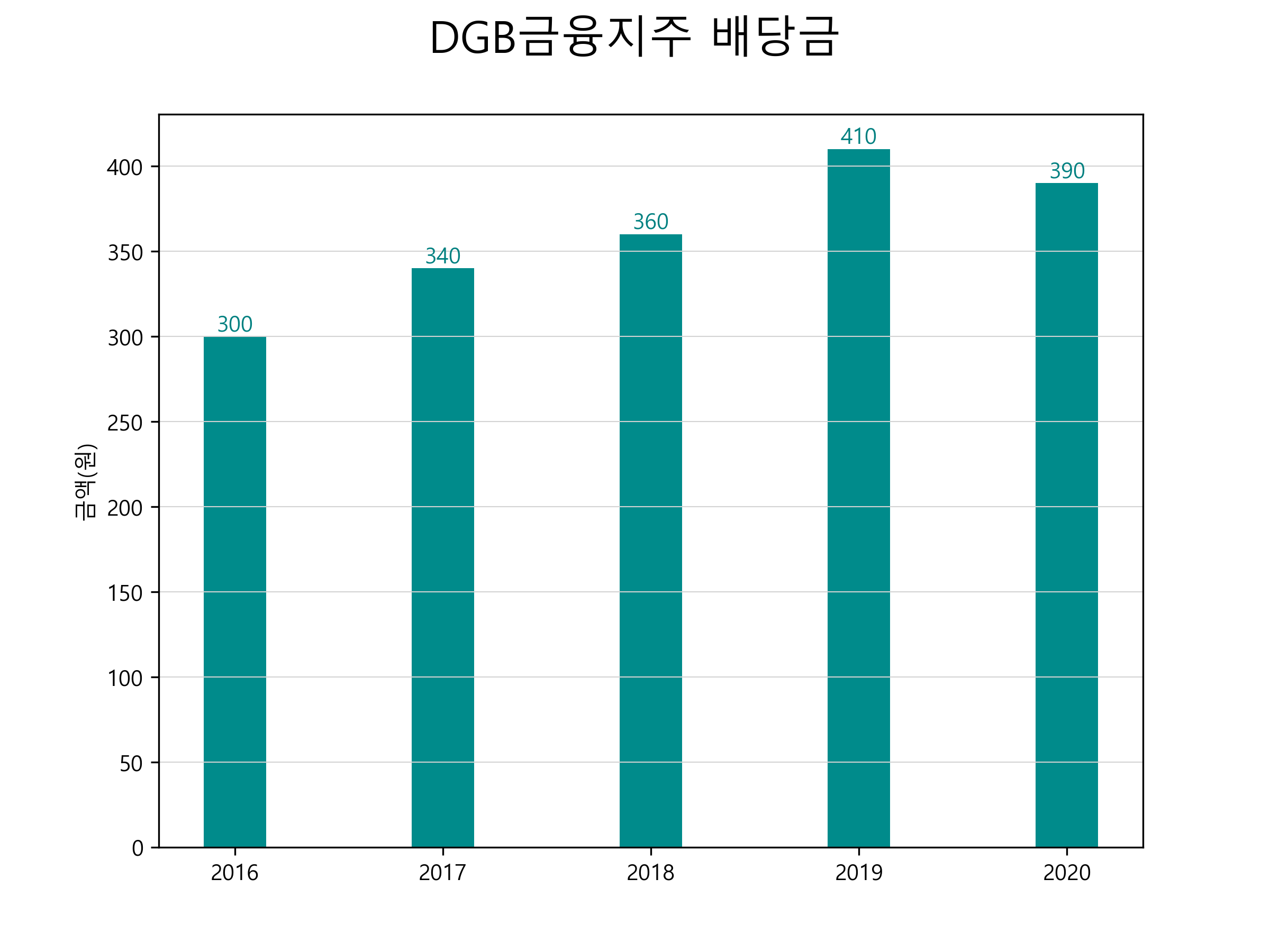 2020년 배당금은 390원 입니다. 작년 배당금인 410원보다 -4.9% 감소했습니다.