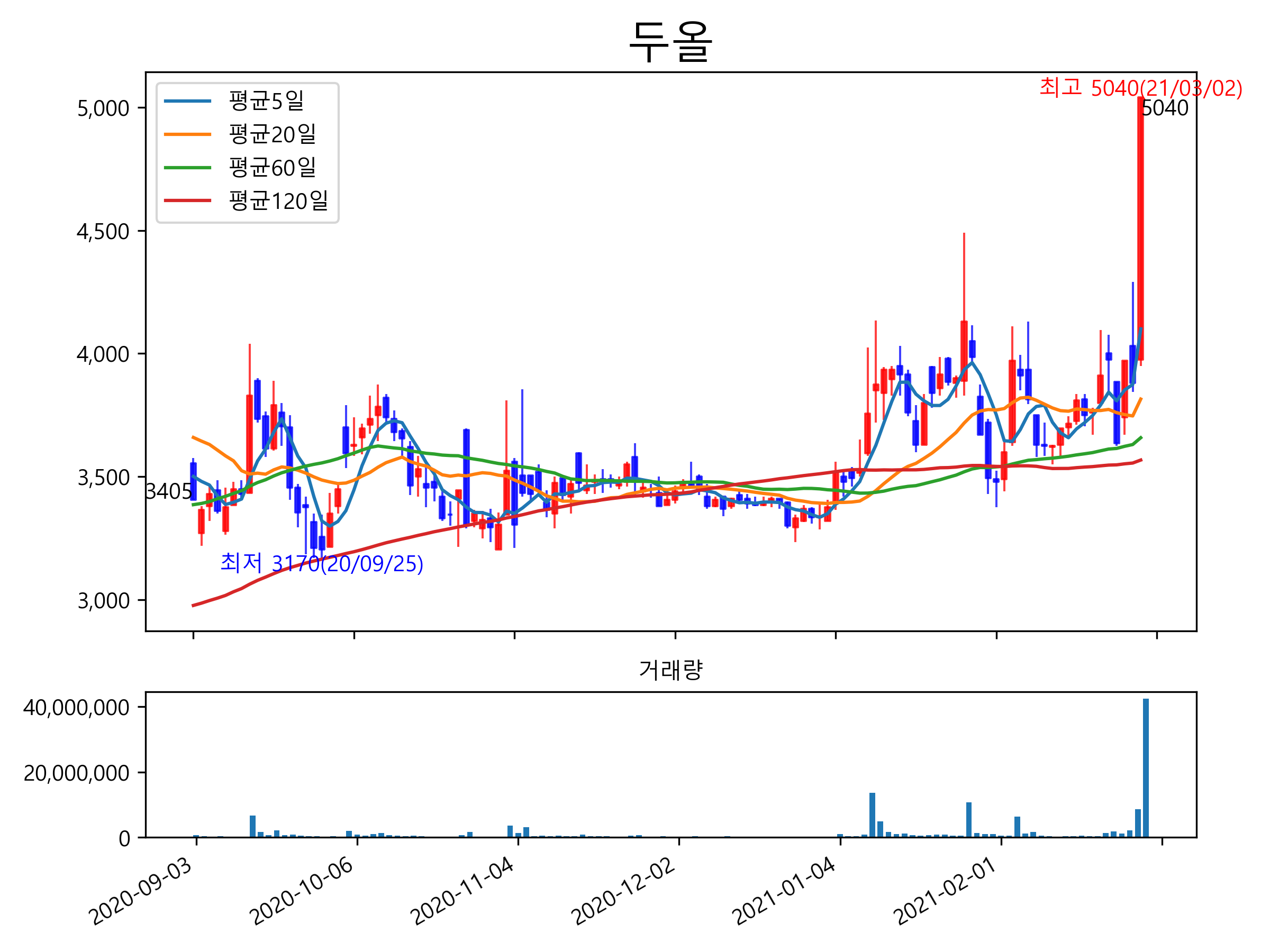 최근 6개월간 캔들차트 및 이동평균선입니다.