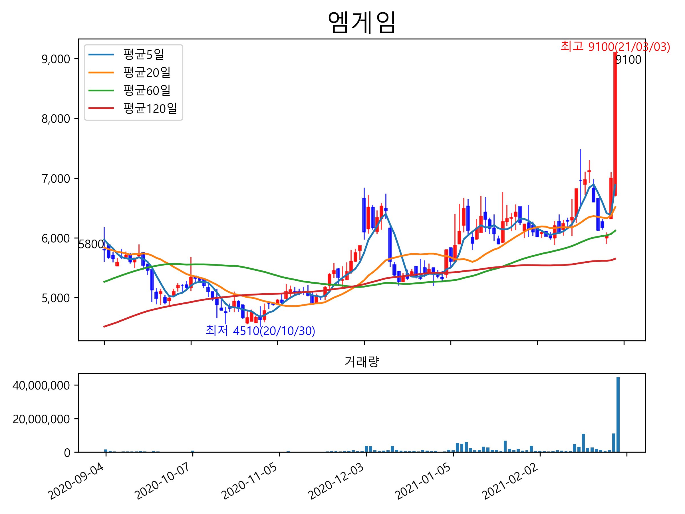 최근 6개월간 캔들차트 및 이동평균선입니다.