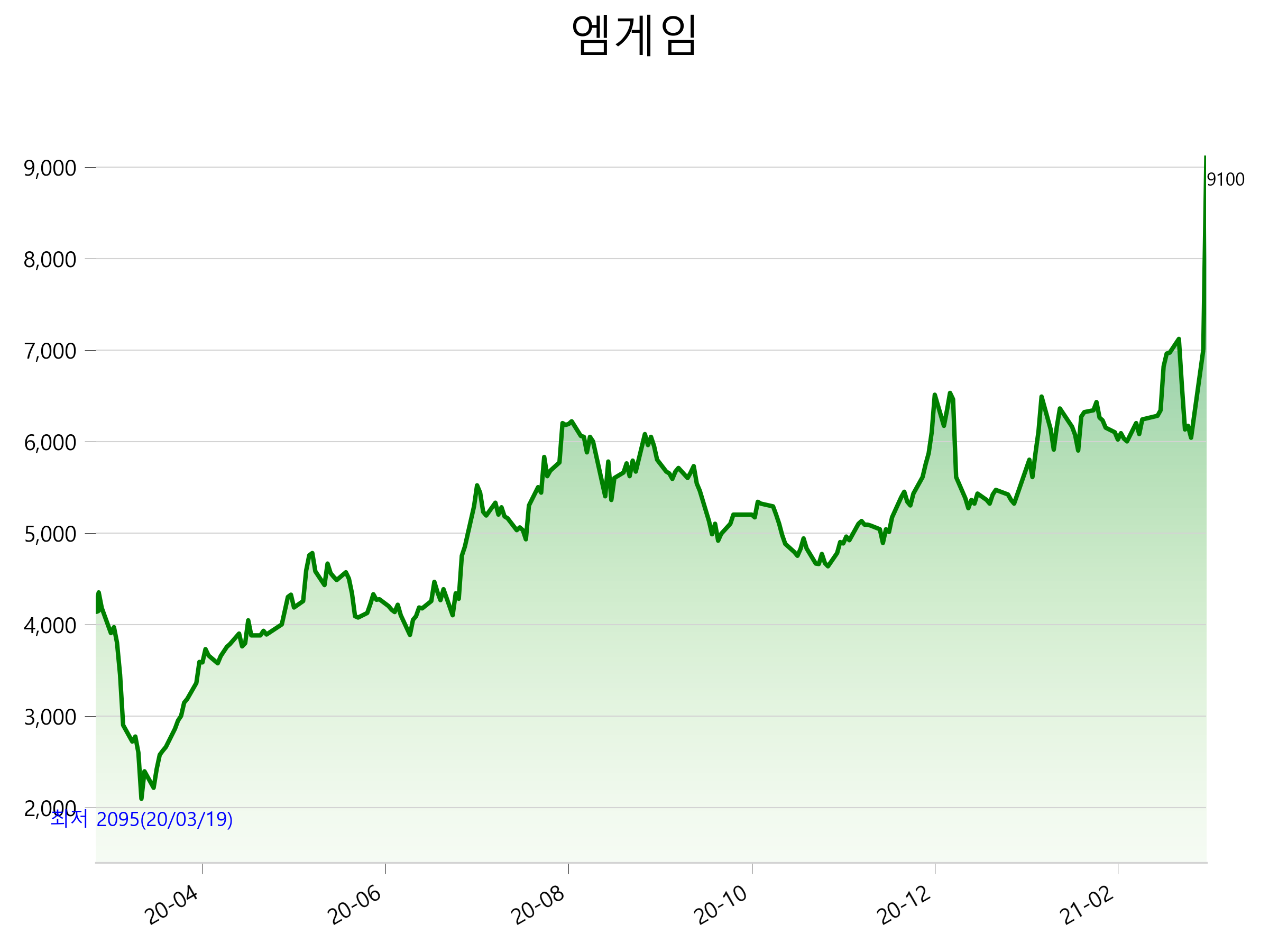 52주 최고가는 9,100원(2021-03-03), 52주 최저가는 2,095원(2020-03-19)으로 52주간 주가 상승률은 117.4% 입니다.