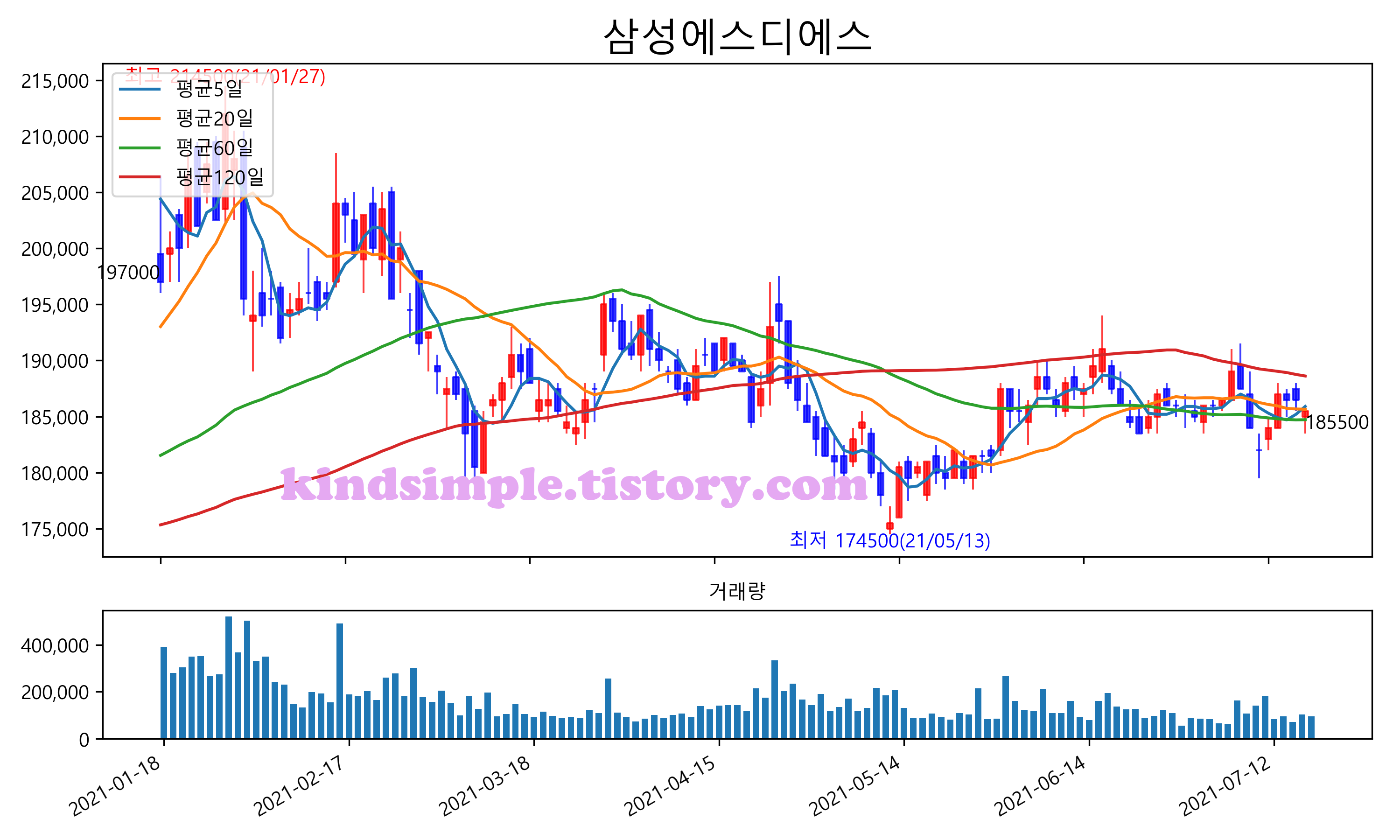 최근 6개월간 캔들차트 및 이동평균선입니다.