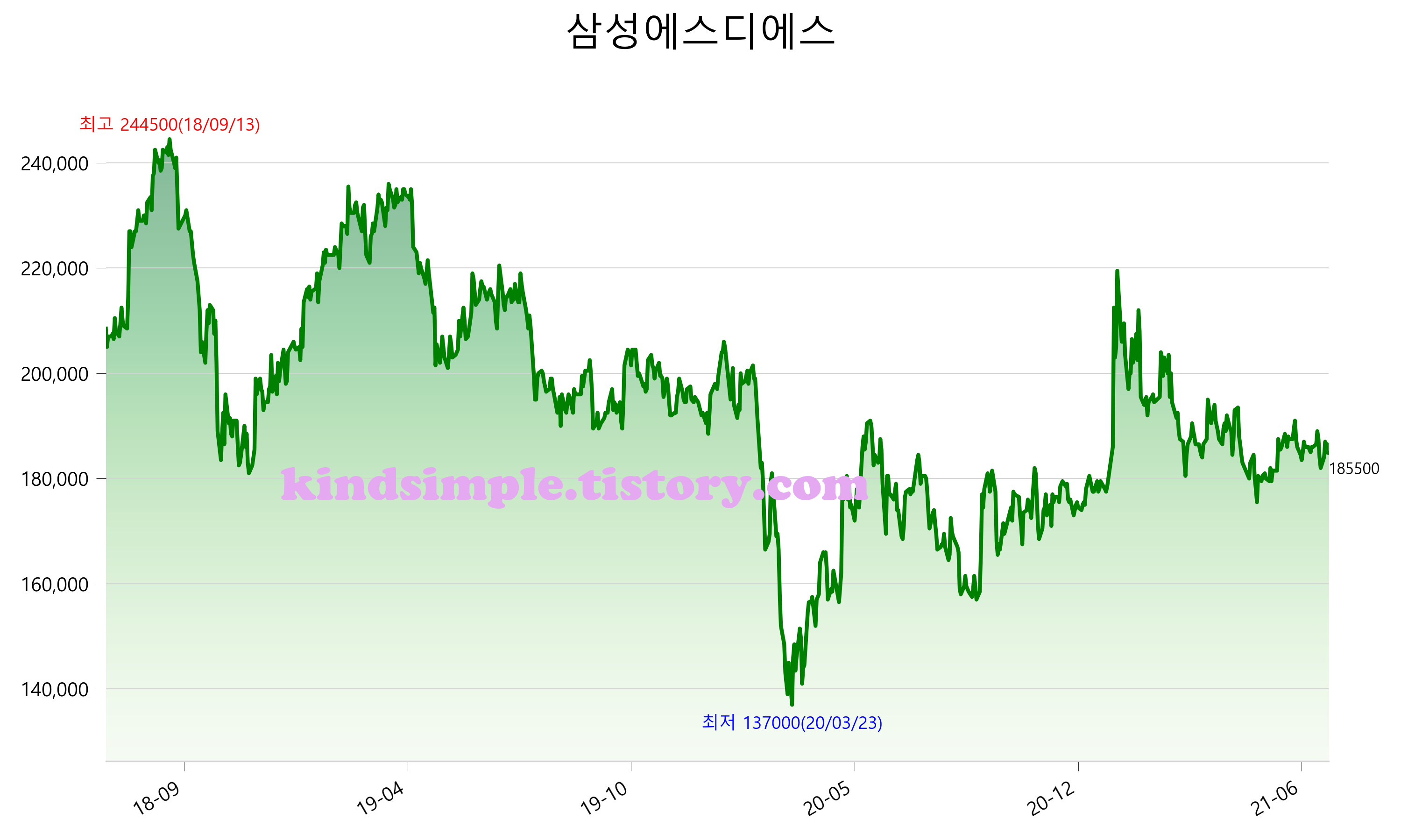 7월 16일 기준 주가는 185,500원 입니다. 아래는 최근 3년간의 주가흐름입니다.