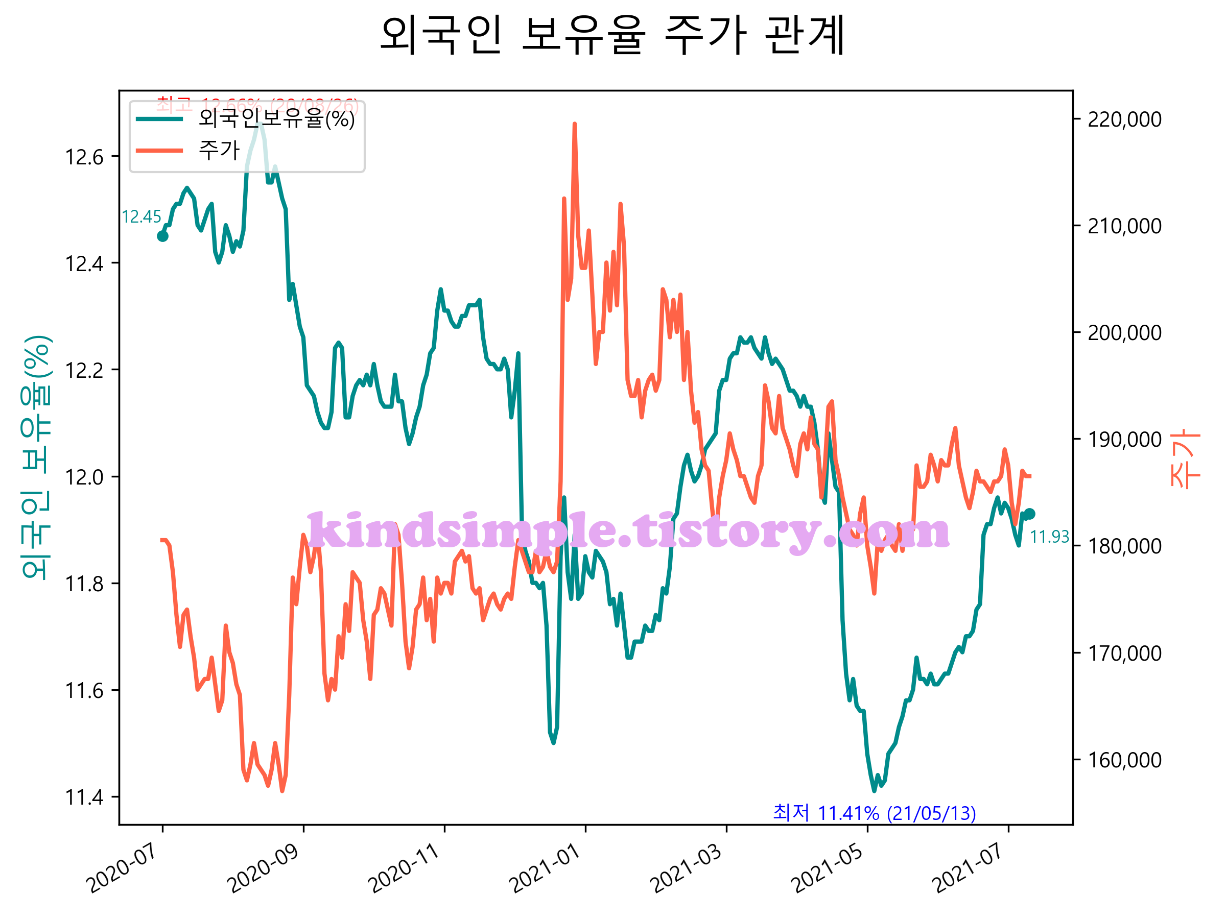 최근 1년간 외국인 보유율 및 주가와의 관계입니다.