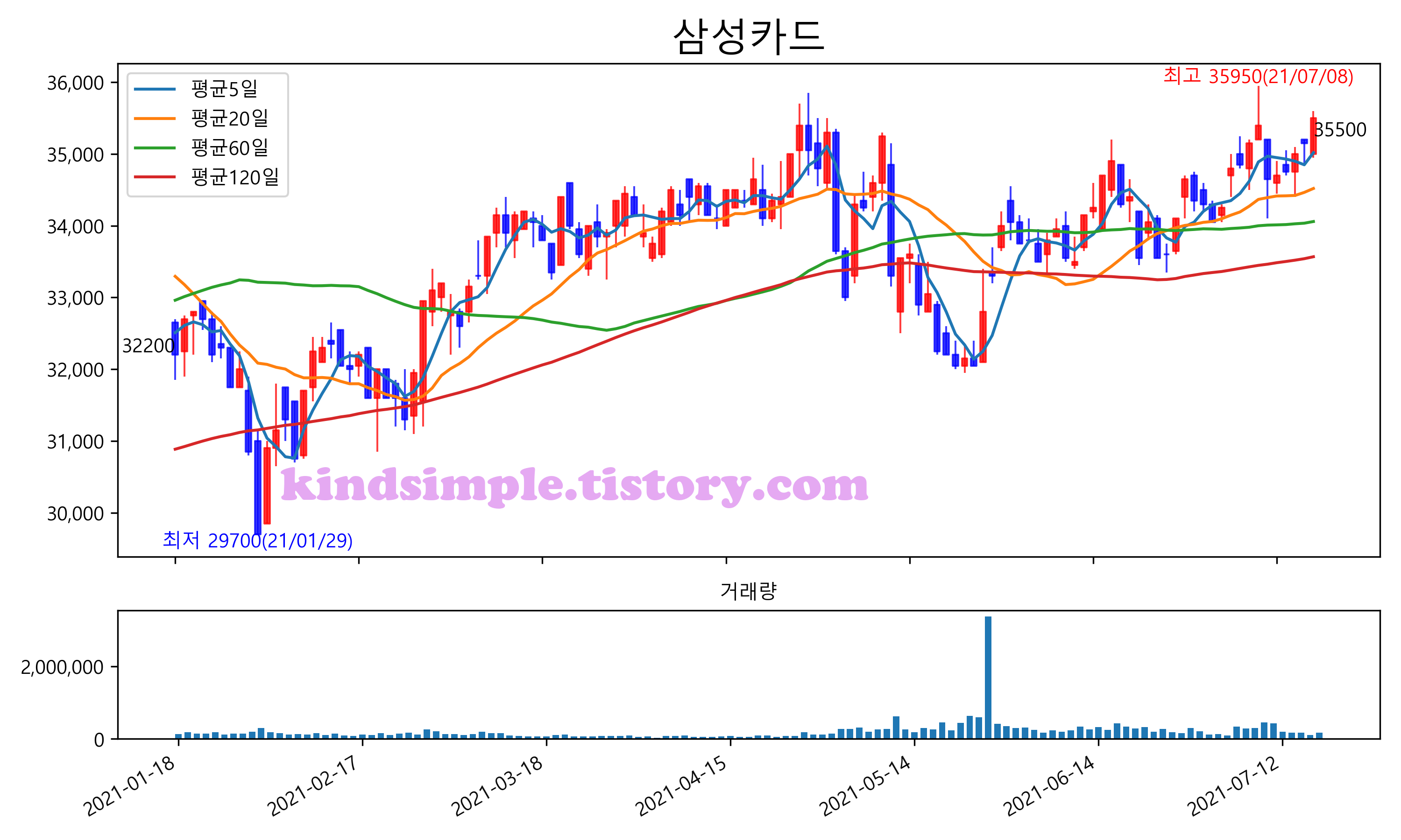 최근 6개월간 캔들차트 및 이동평균선입니다.