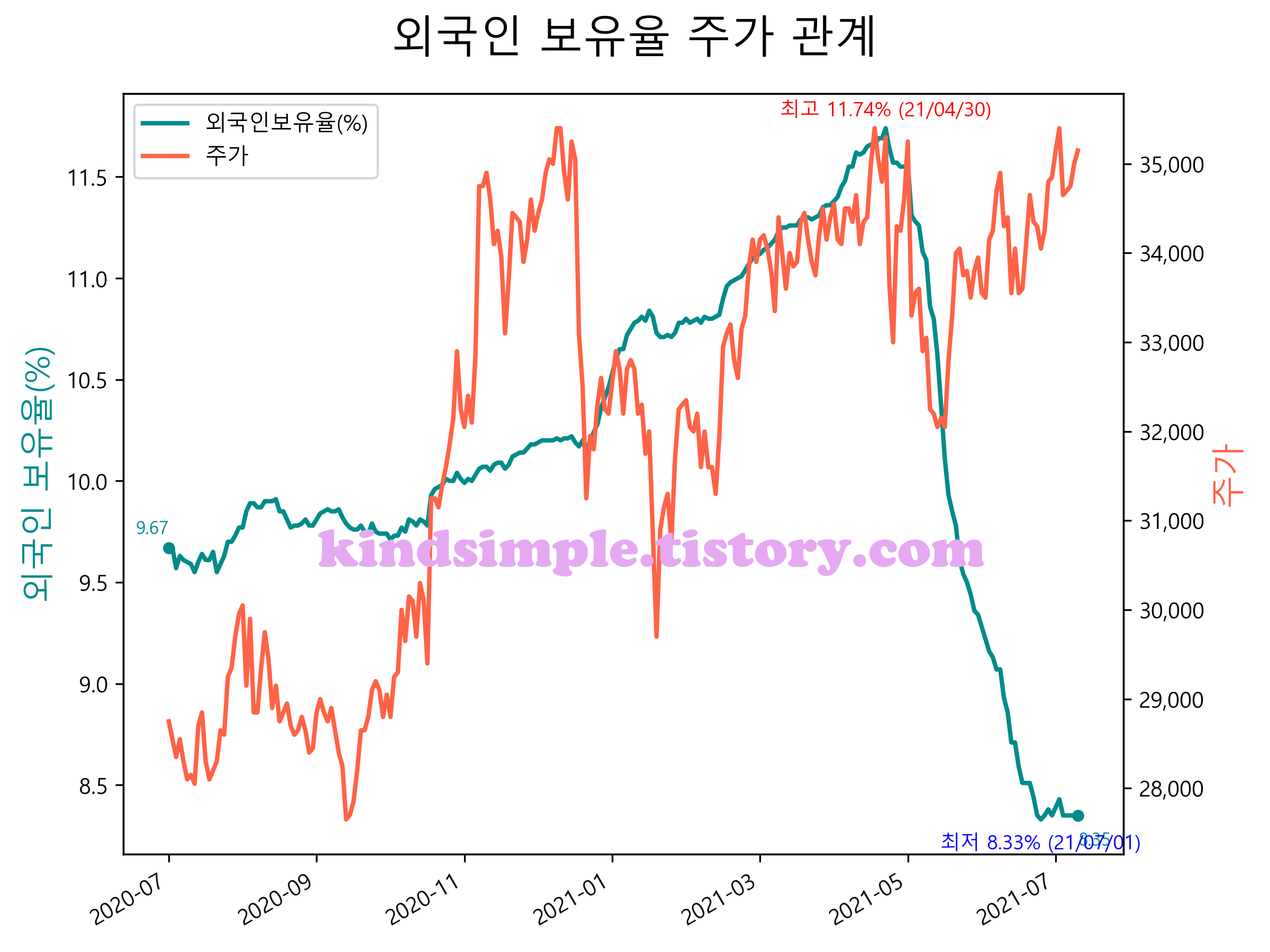 최근 1년간 외국인 보유율 및 주가와의 관계입니다.