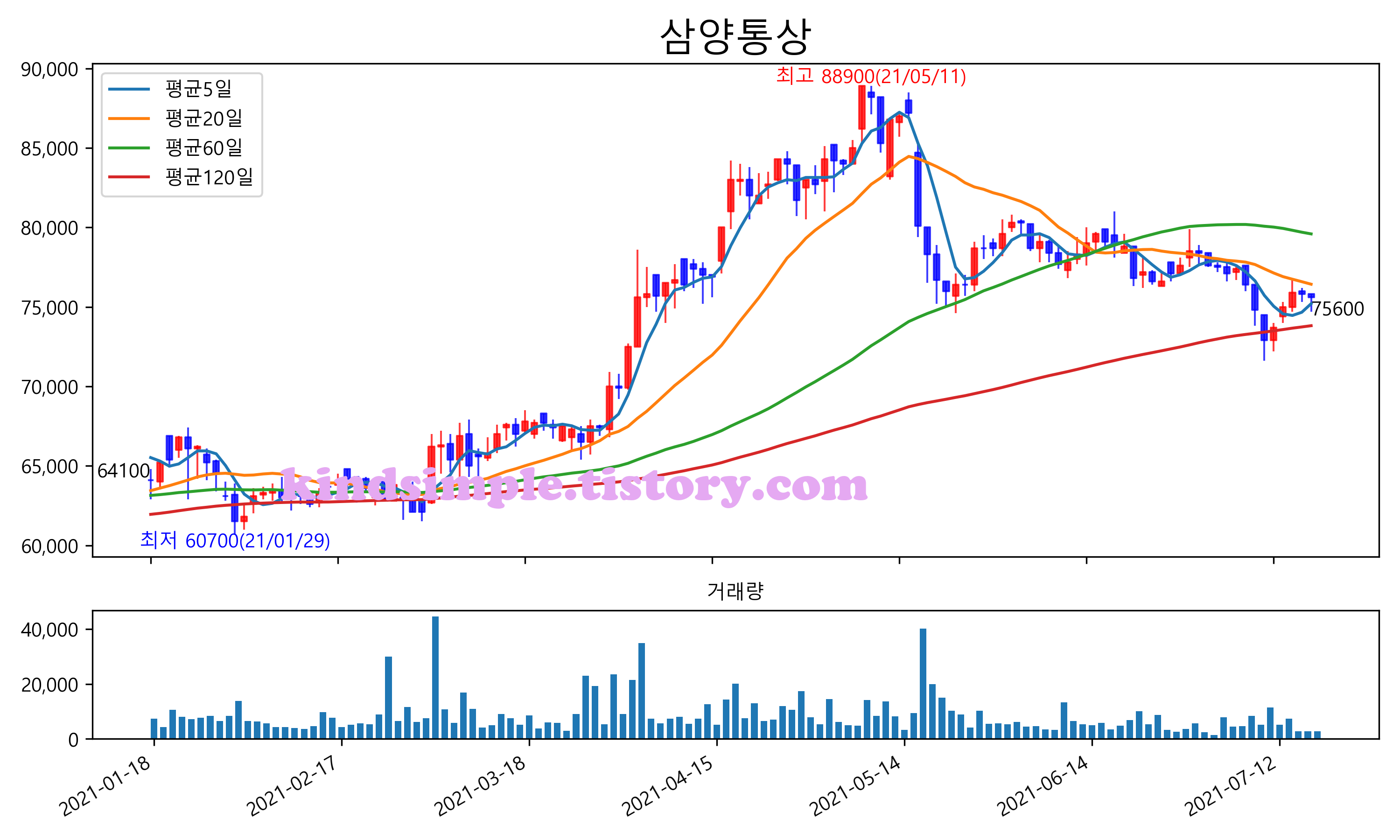 최근 6개월간 캔들차트 및 이동평균선입니다.