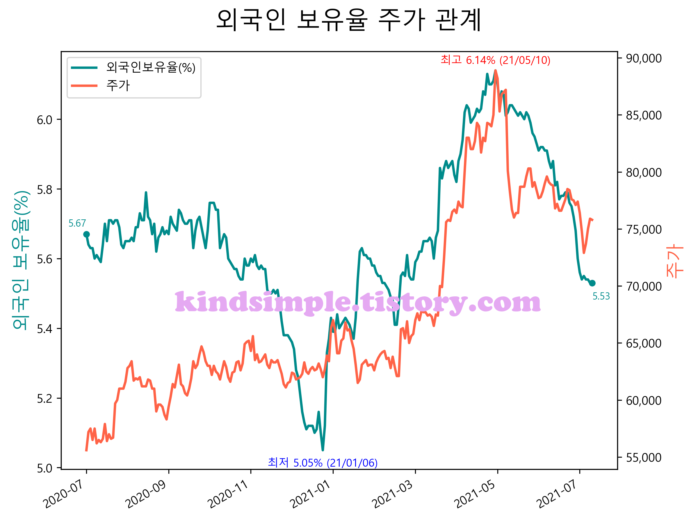 최근 1년간 외국인 보유율 및 주가와의 관계입니다.