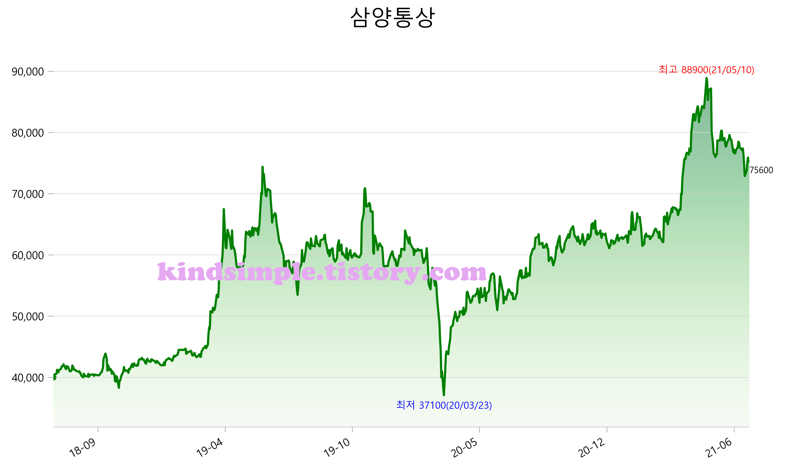 7월 16일 기준 주가는 75,600원 입니다. 아래는 최근 3년간의 주가흐름입니다.
