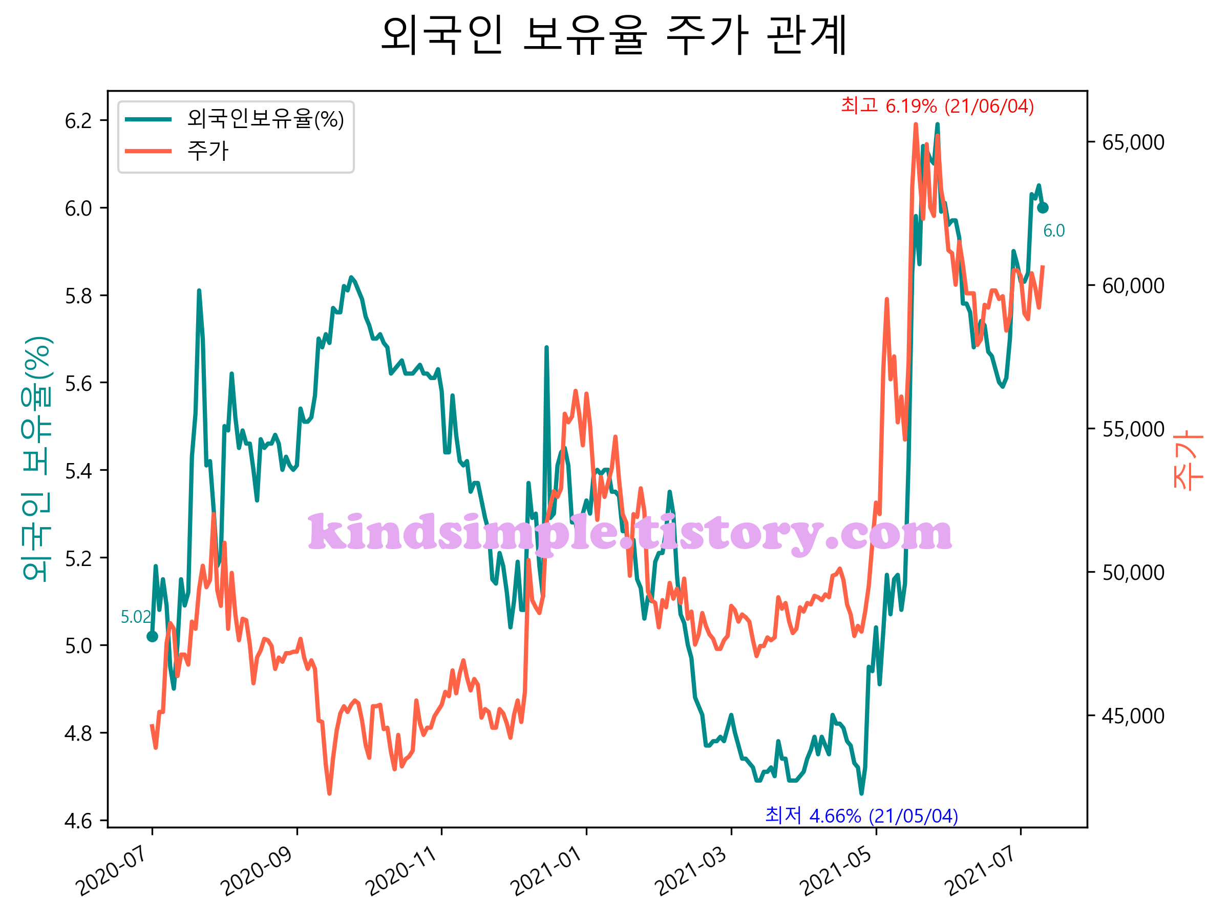 최근 1년간 외국인 보유율 및 주가와의 관계입니다.