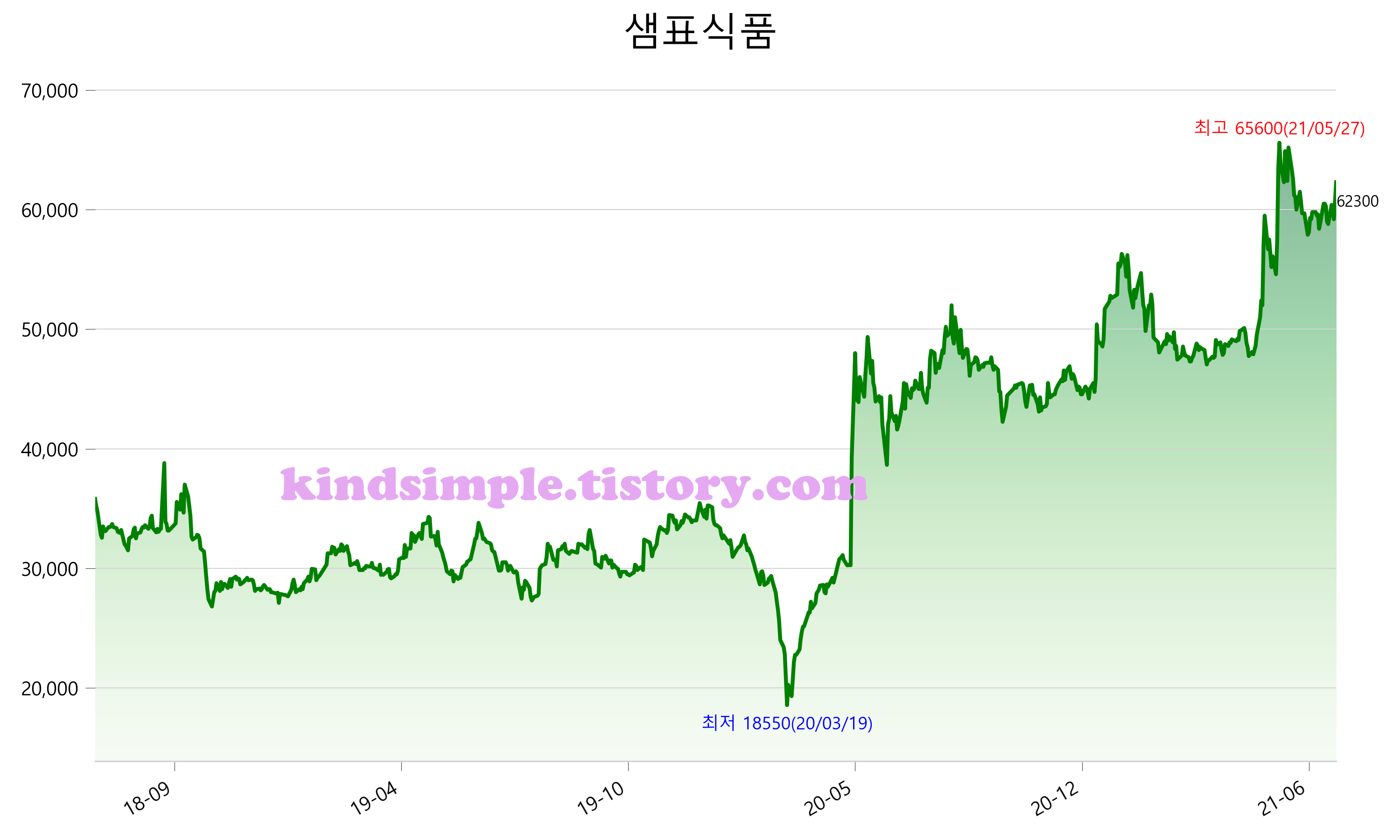 7월 16일 기준 주가는 62,300원 입니다. 아래는 최근 3년간의 주가흐름입니다.