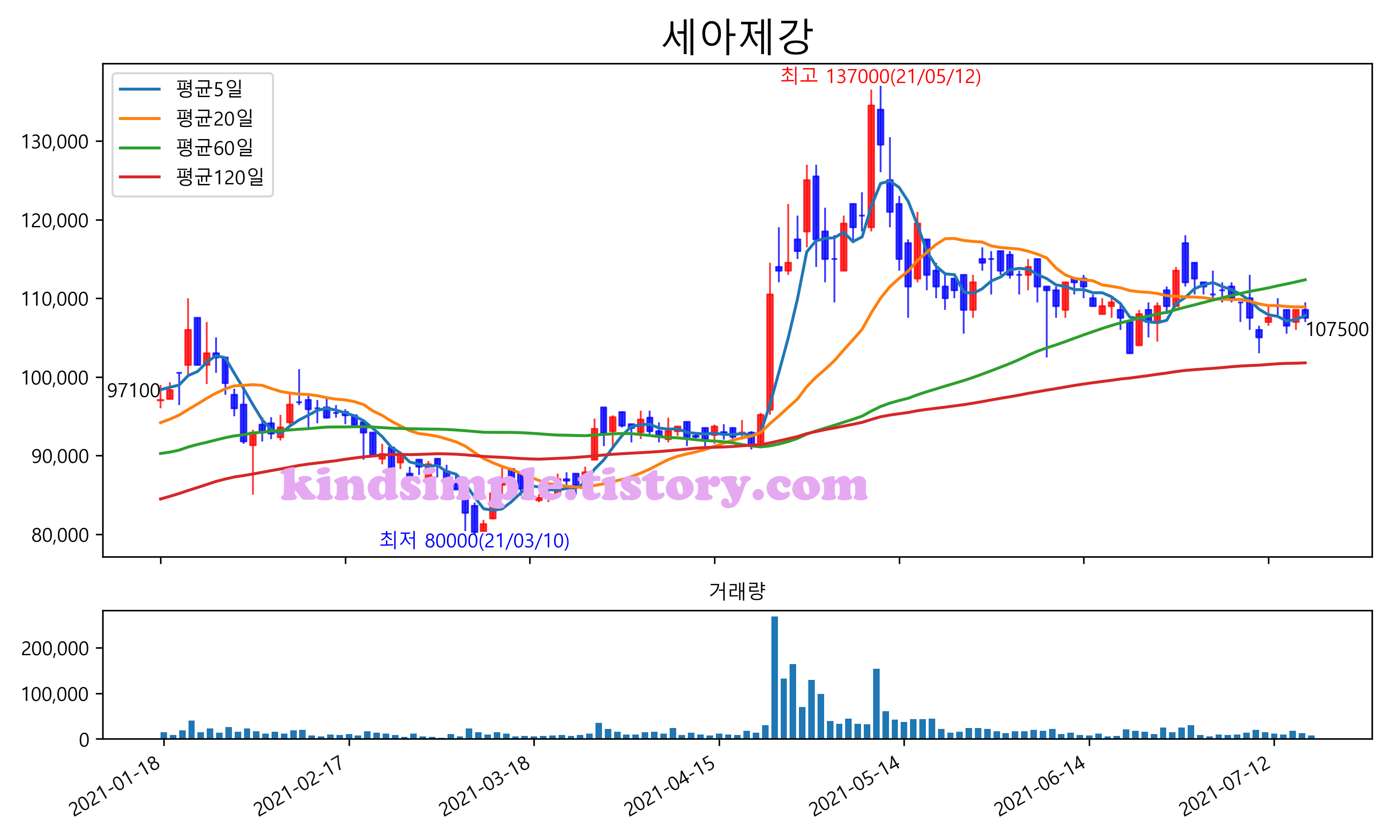 최근 6개월간 캔들차트 및 이동평균선입니다.