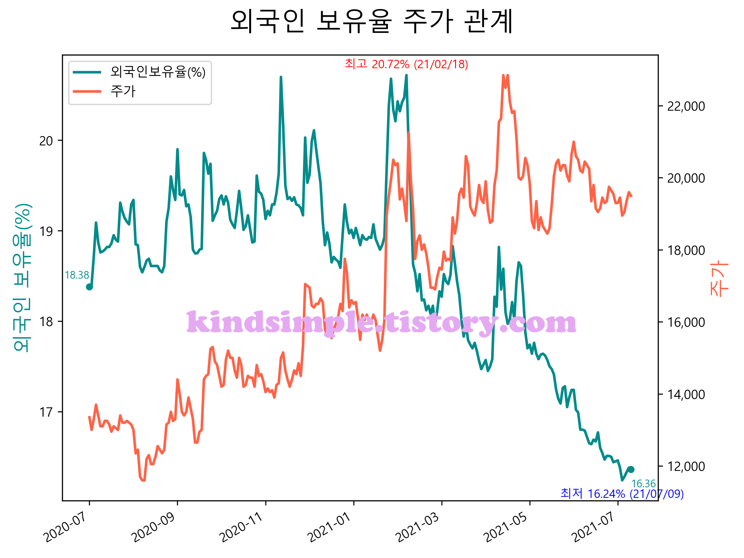 최근 1년간 외국인 보유율 및 주가와의 관계입니다.