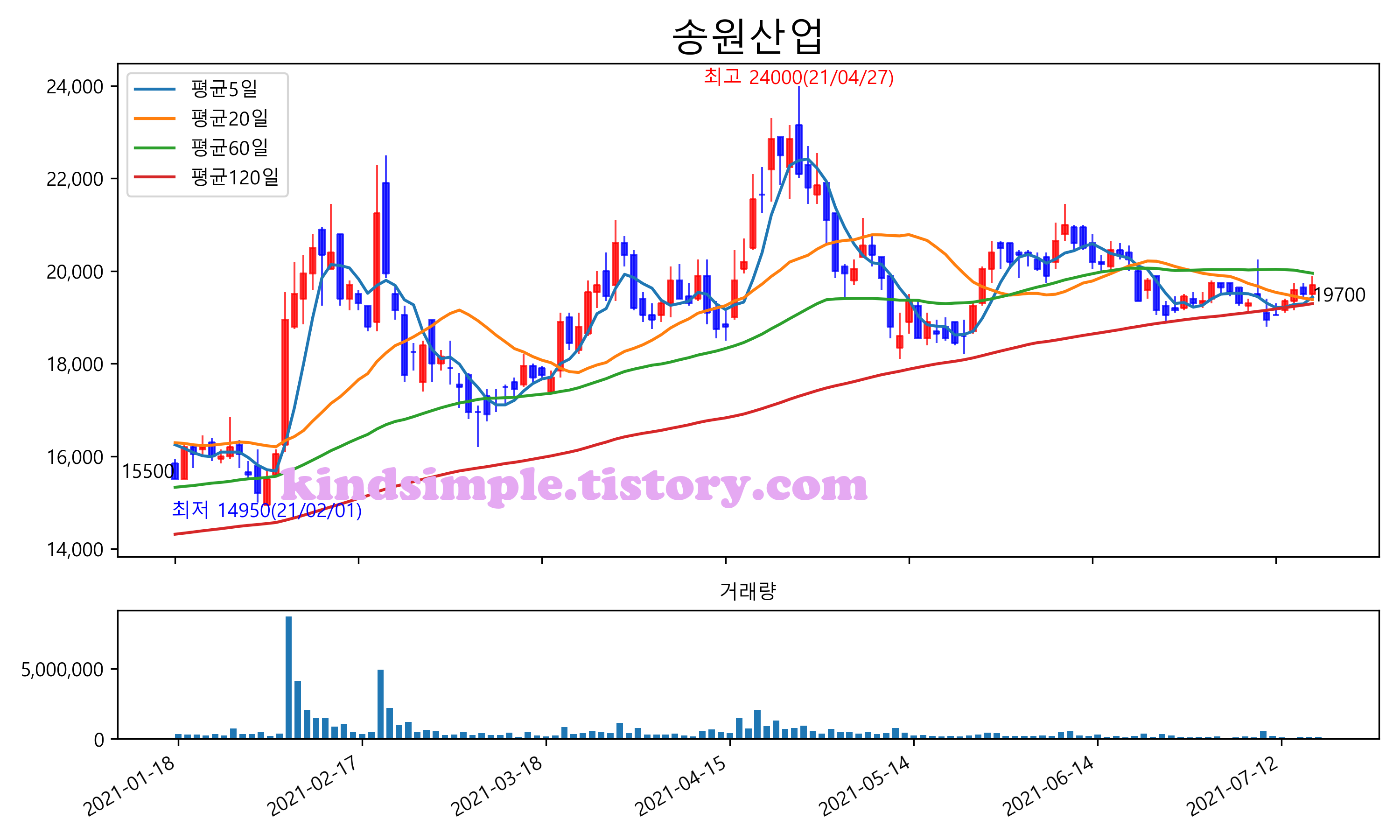 최근 6개월간 캔들차트 및 이동평균선입니다.
