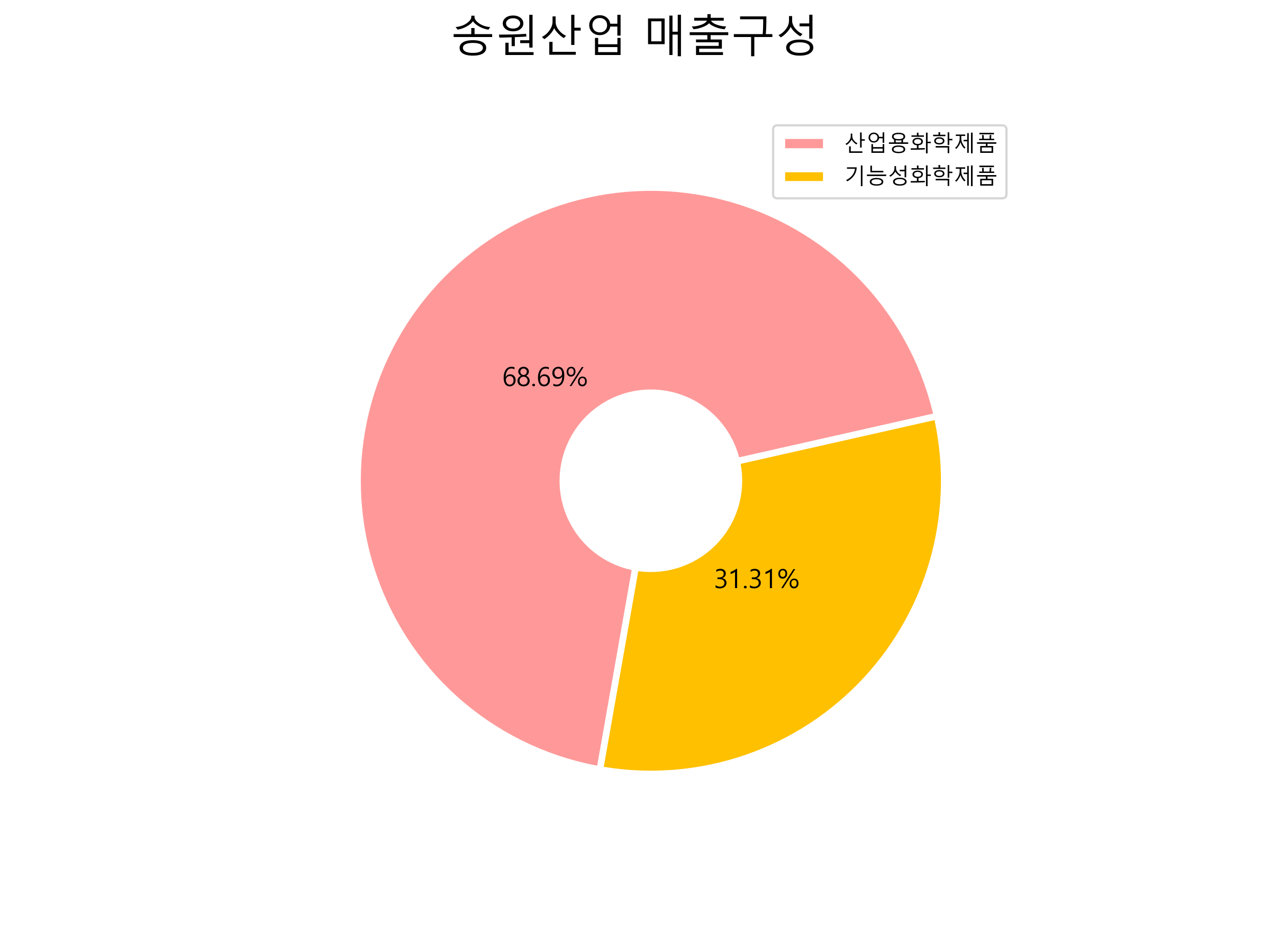 - 1965년 화학제품의 제조, 가공 및 판매를 위해 송원산업주식회사로 설립되었으며, 1977년 유가증권시장에 상장됨.