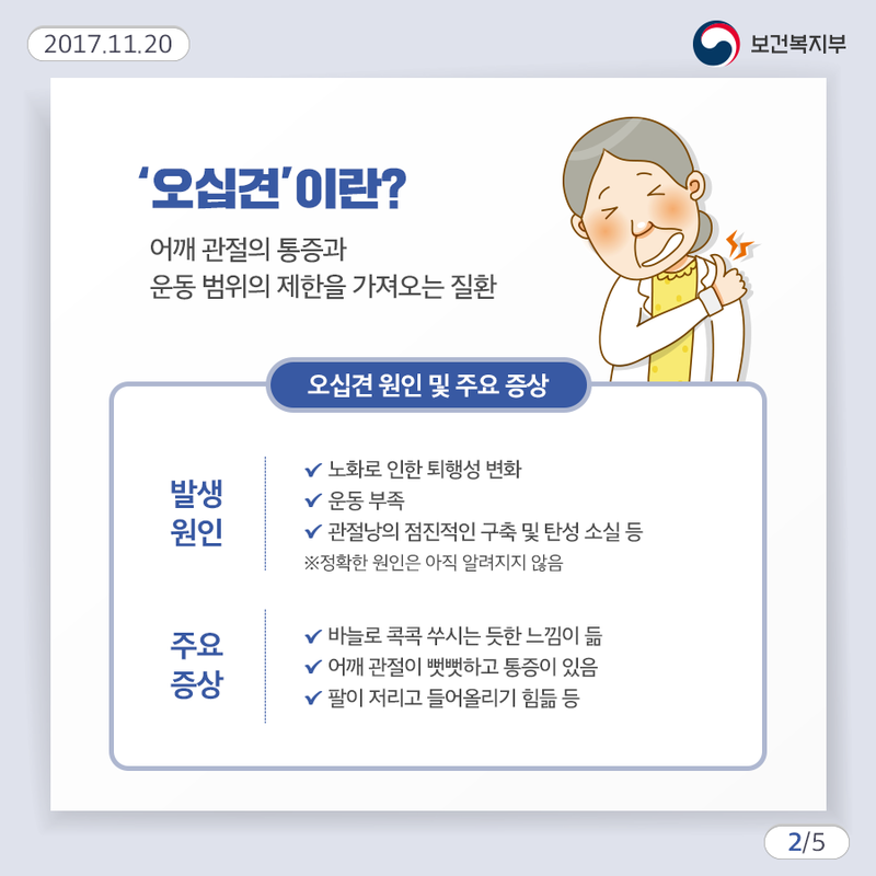 어깨 통증이 심하며 팔을 앞으로 들기 힘들거나 밖으로 돌리기 힘들면 오십견을 의심해봐야 합니다. 오십견의 주요증상은 어깨관절이 뻣뻣하고 팔을 들어올리거나 뒤로 젖힐 때 삐끗하는 느낌이 들면서 아픈 것입니다. 갑자기 잠을 자다가 어깨가 아파서 깰때가 있고, 어깨를 쓰지 않아도 바늘로 찌르는 듯한 통증을 느끼기도 합니다. 샤워를 할때 목이나 어깨 뒤를 씻기 힘들며 원하는 대로 팔이 잘 움직여지지 않아 업무나 일상생활하기에 불편합니다.