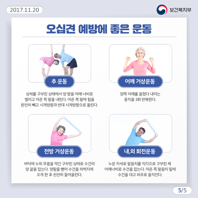 운동부족, 책상 앞에 오래않아 컴퓨터 작업, 구부정한 자세로 장시간 스마트폰 사용, 같은 동작이 반복되는 작업 등을 하는 경우 오십견에 걸릴 확률이 더 높아집니다.