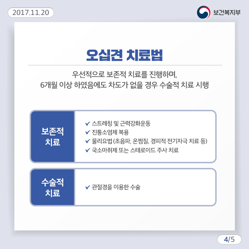 오십견은 스트레칭을 통한 운동요법과 약물을 통한 통증조절을 시행하면 증상이 많이 호전됩니다. 막연히 시간이 지나면 낫겠지 하면 증상이 1~2년 이상 지속될 수 있으므로 적극적인 치료를 받아야합니다.