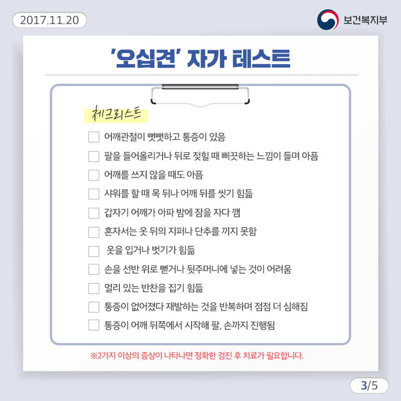 다음과 같은 자가진단을 해보았는데 통증이 있다면 오십견으로 의심해보고 정형외과에서 진료를 받아보시는 것이 좋습니다.