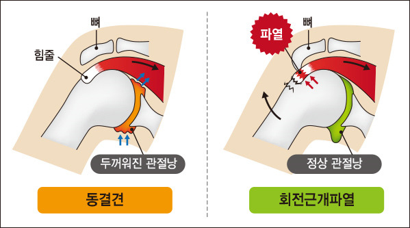 어깨에는 많은 신경이 모여있는 조직으로 어깨 부근의 통증이 무조건 오십견은 아닙니다. 회전근개의 변형과 파열이 생긴 경우 회전근개증후군이라고 불리며, 관절낭이 두꺼워져서 통증이 발생한 경우 동결견(오십견)으로 진단됩니다.
