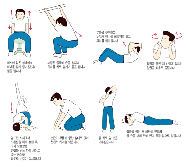 사무실에서 이렇게 간단하게 스트레칭 하는 것만으로도 목 디스크나 오십견 등을 예방할 수 있습니다.