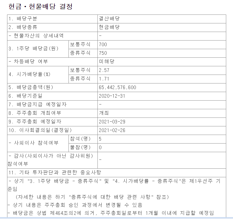 보통주는 700원, 우선주는 750원이 배당되며, 시가배당율은 보통주는 2.57%, 우선주는 1.71% 입니다. 배당금 총액은 654억원 규모입니다.