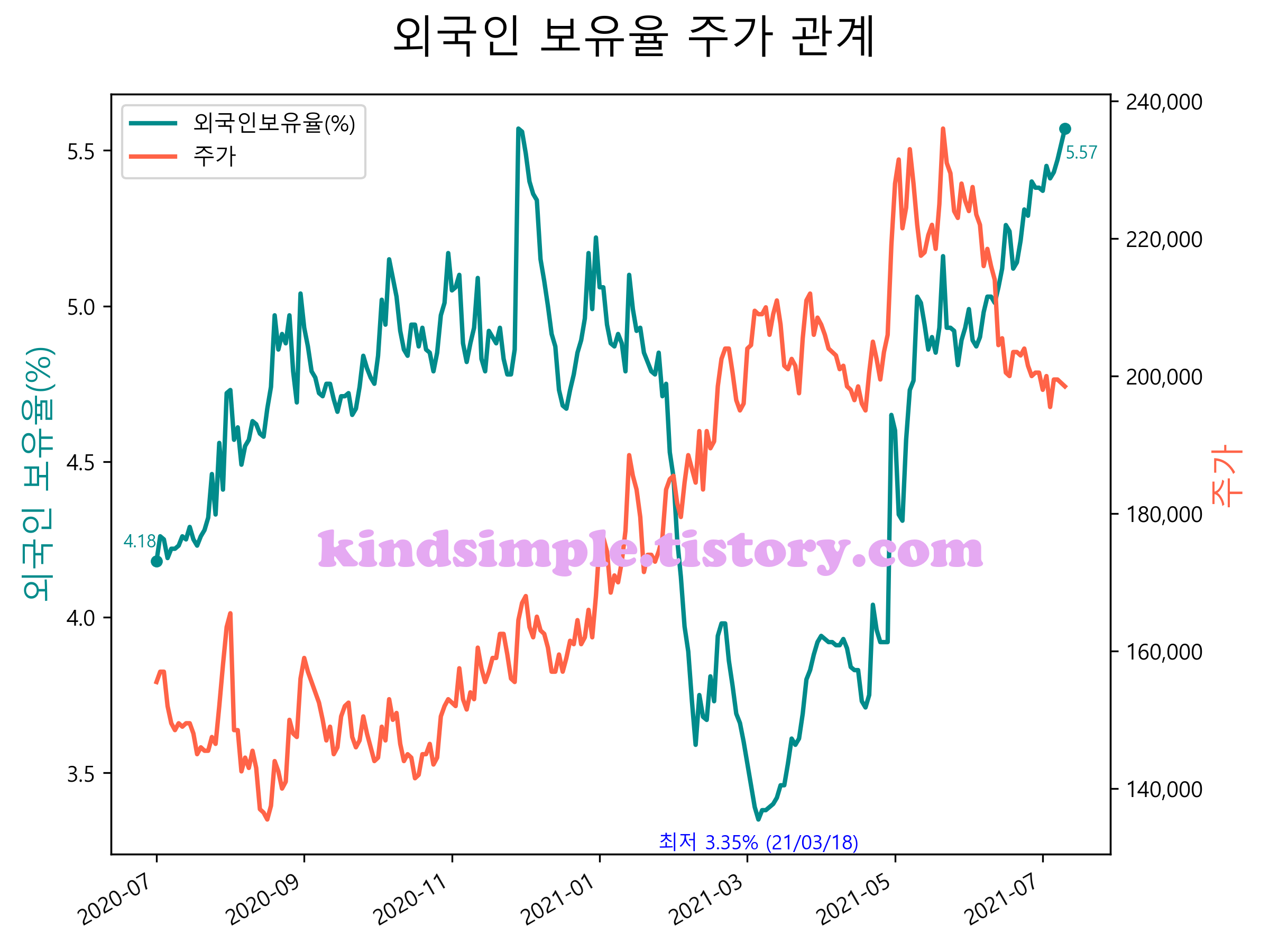 최근 1년간 외국인 보유율 및 주가와의 관계입니다.