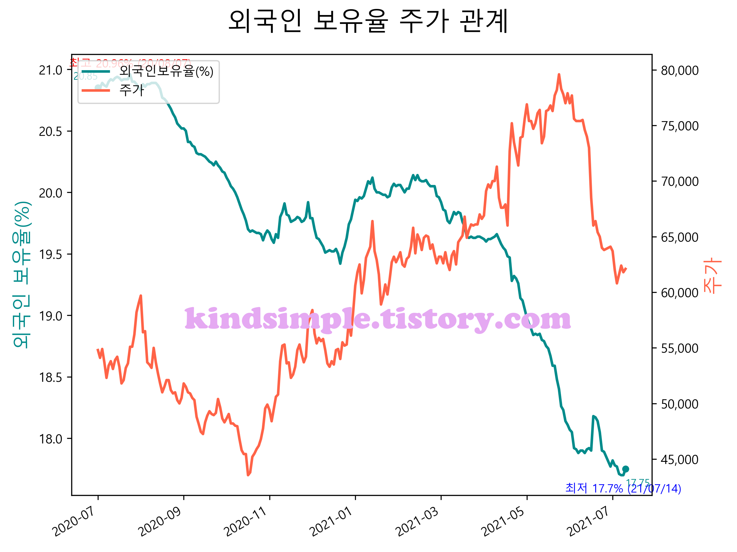 최근 1년간 외국인 보유율 및 주가와의 관계입니다.