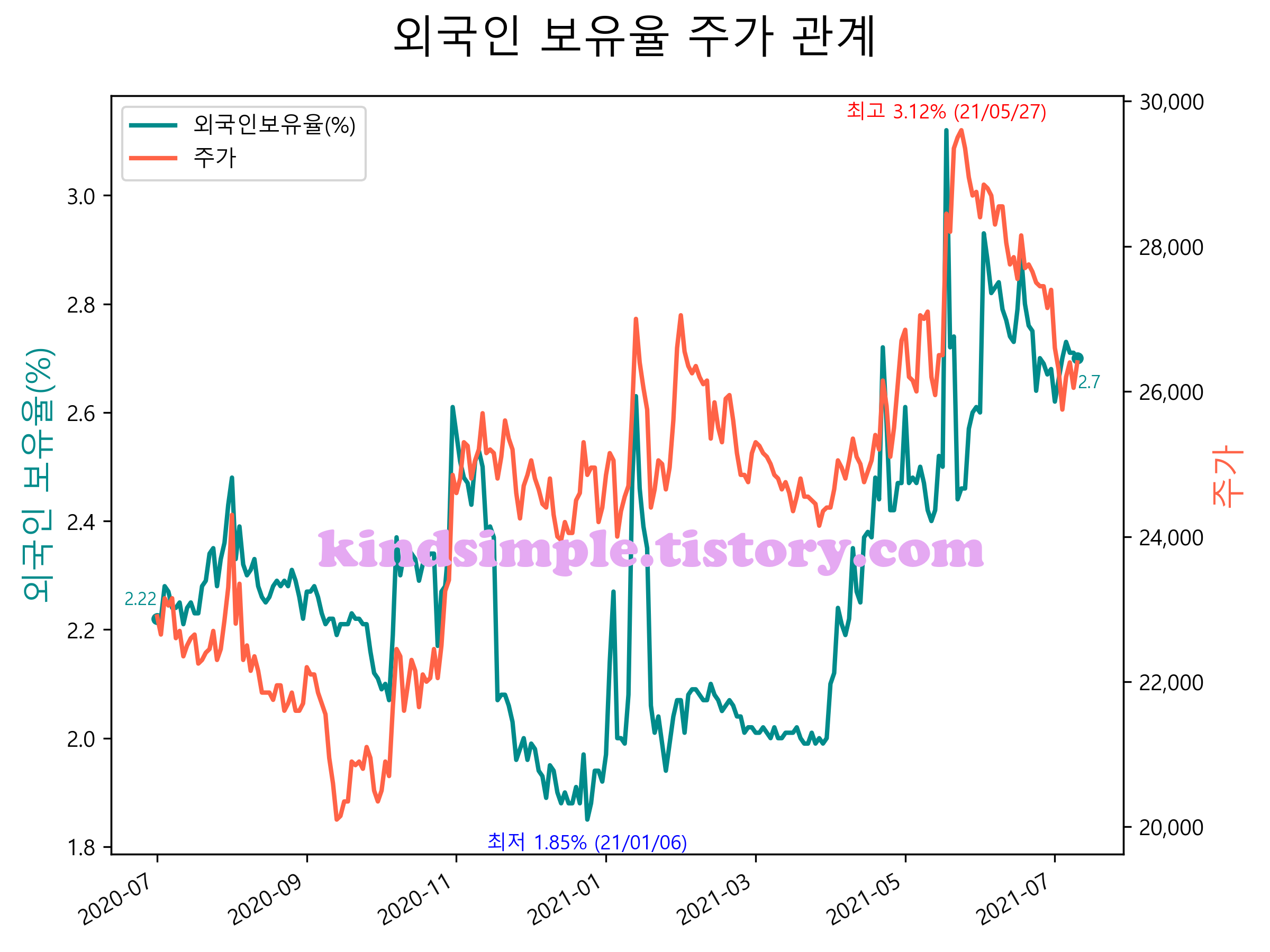 최근 1년간 외국인 보유율 및 주가와의 관계입니다.