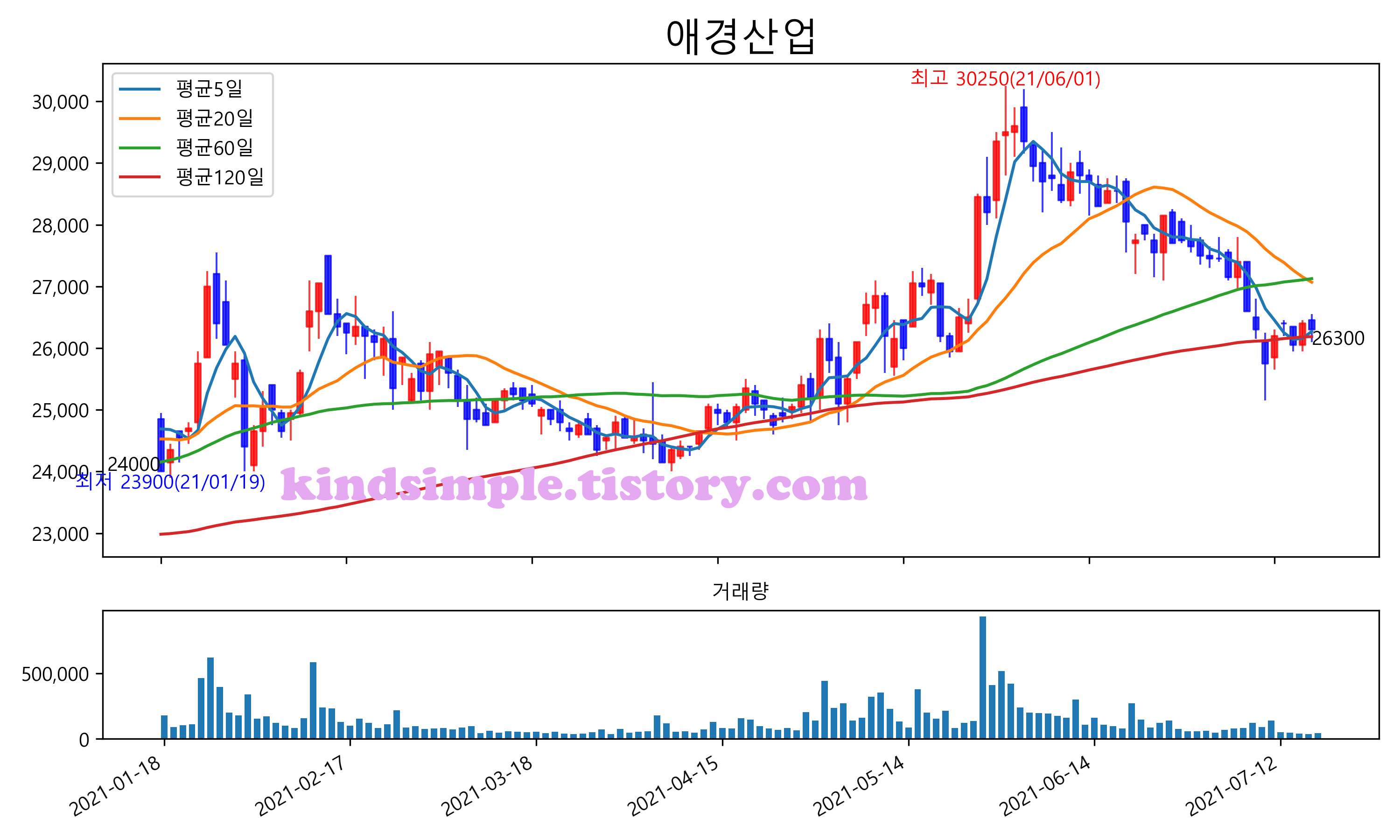 최근 6개월간 캔들차트 및 이동평균선입니다.