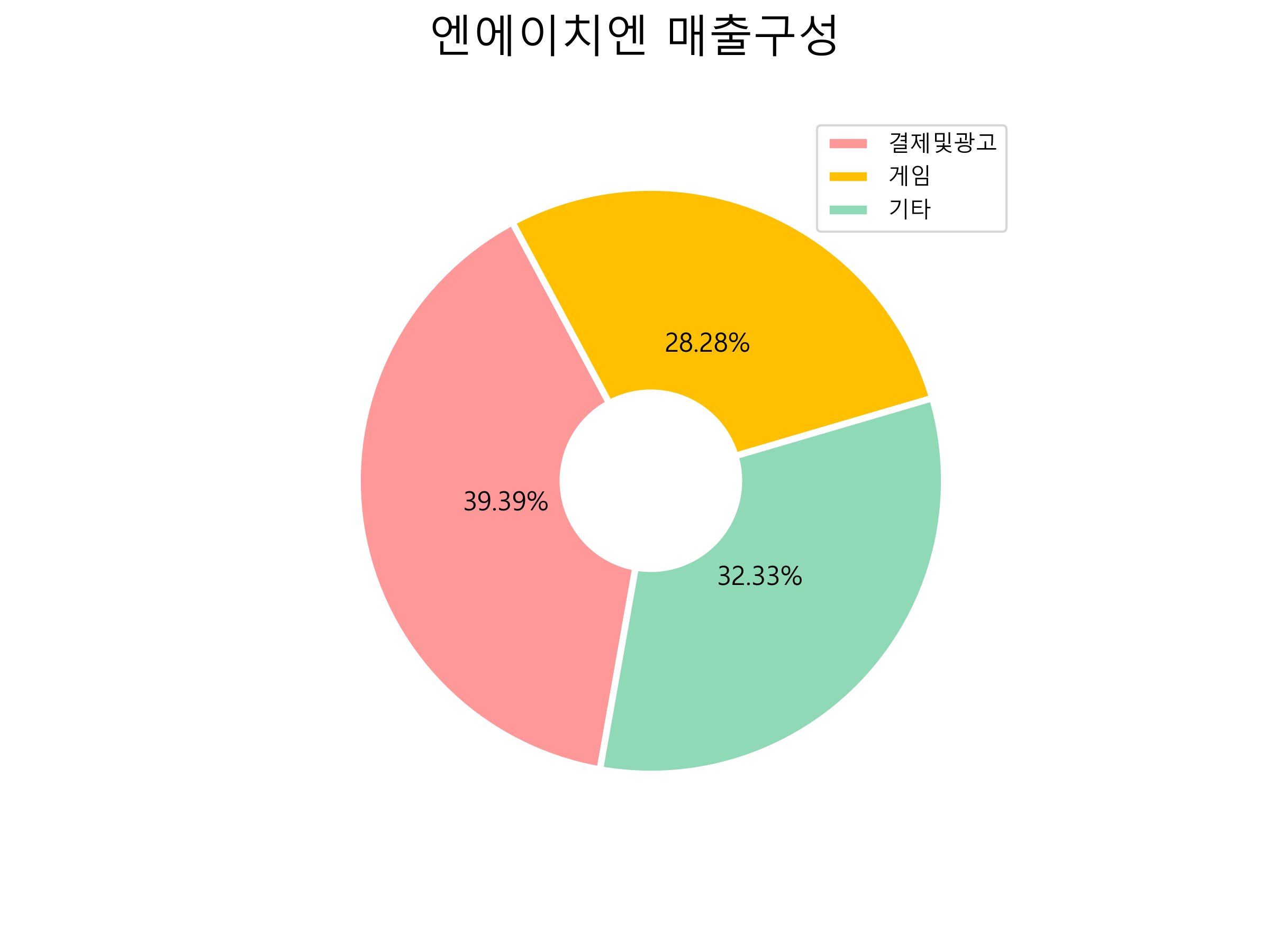 - 매출구성은 결제및광고 39.40%, 게임 32.06%, 기타(컨텐츠 수익 등) 28.54%로 이루어져 있음.