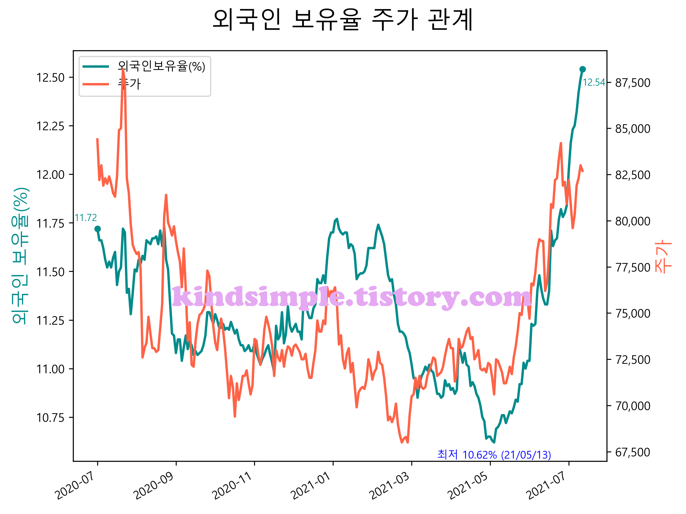 최근 1년간 외국인 보유율 및 주가와의 관계입니다.