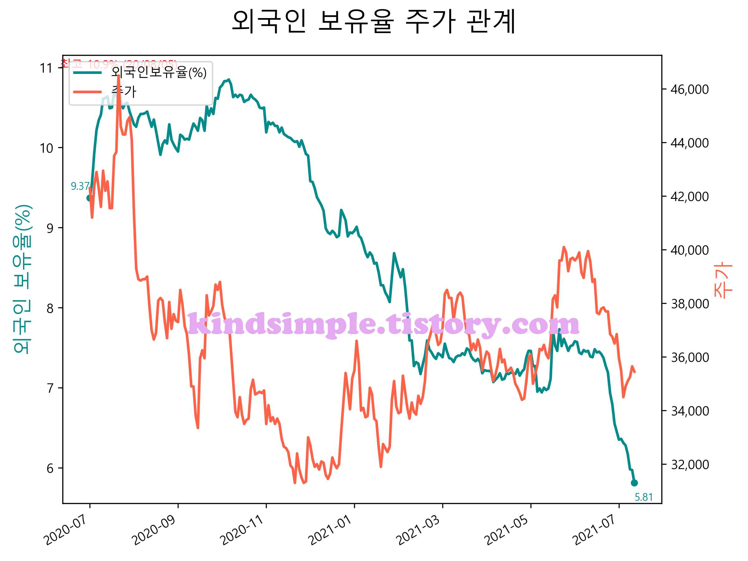 최근 1년간 외국인 보유율 및 주가와의 관계입니다.