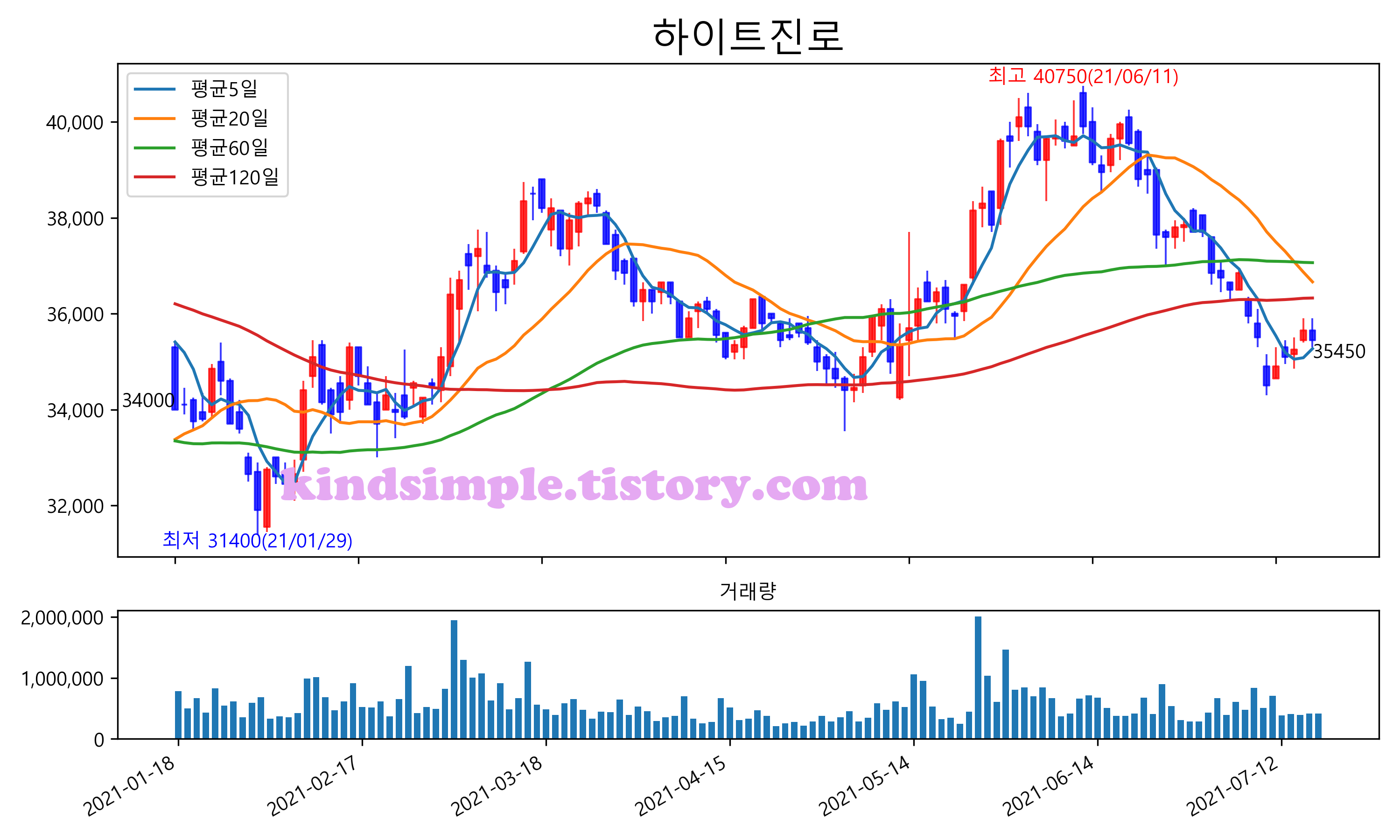 최근 6개월간 캔들차트 및 이동평균선입니다.