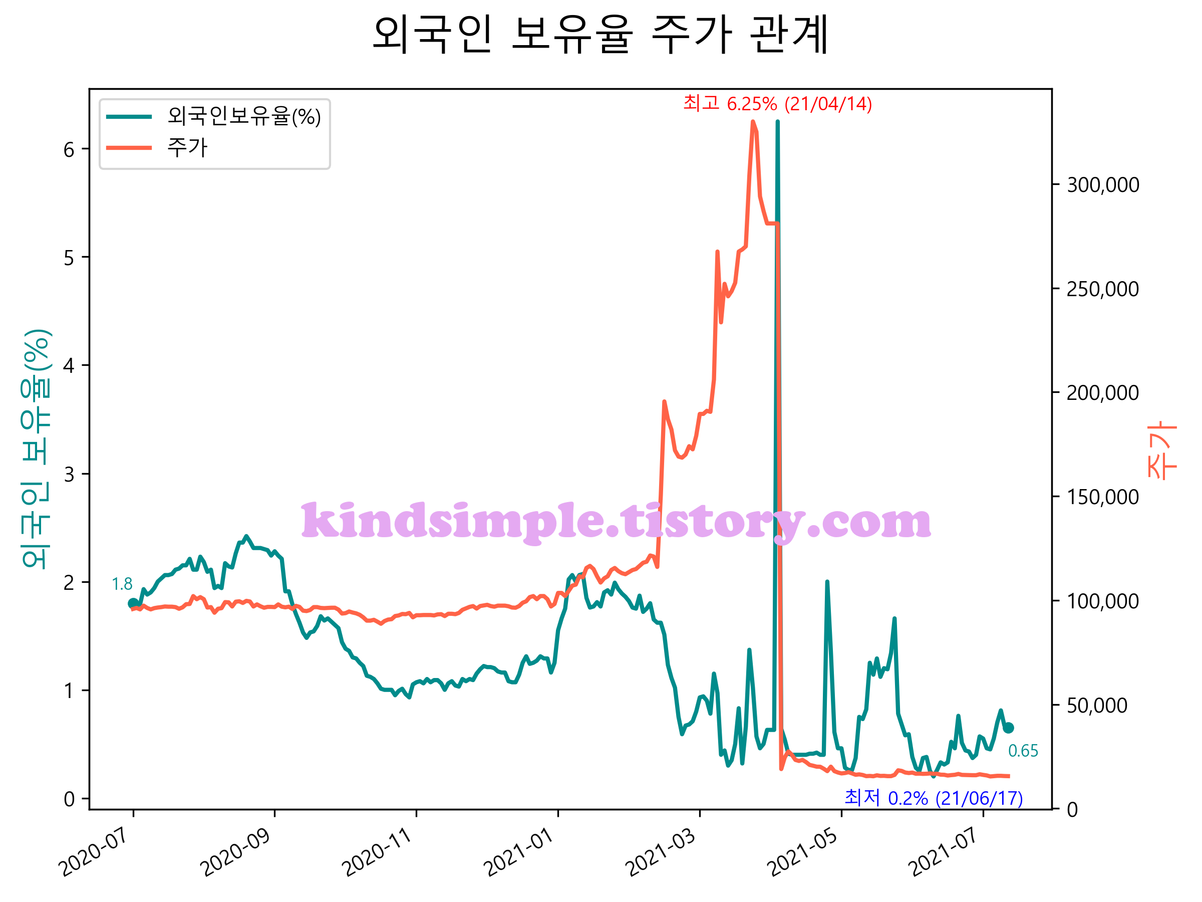 최근 1년간 외국인 보유율 및 주가와의 관계입니다.