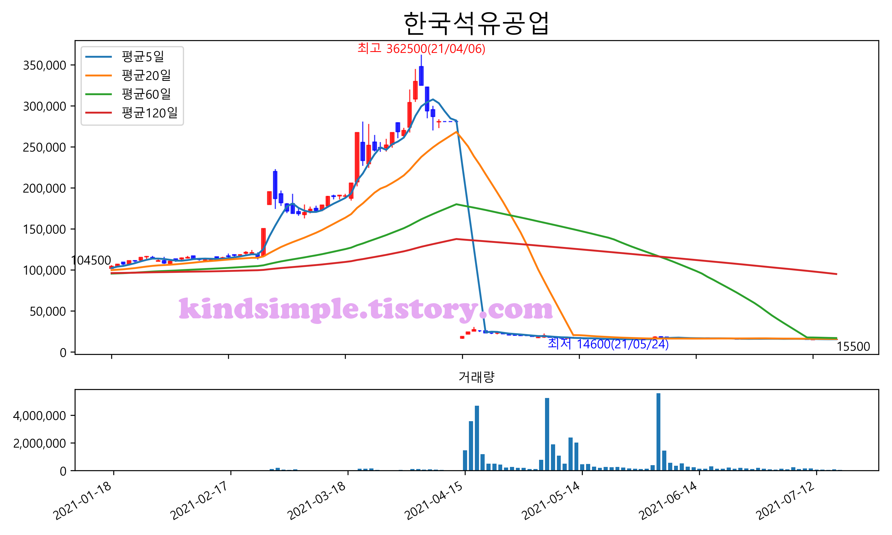 최근 6개월간 캔들차트 및 이동평균선입니다.
