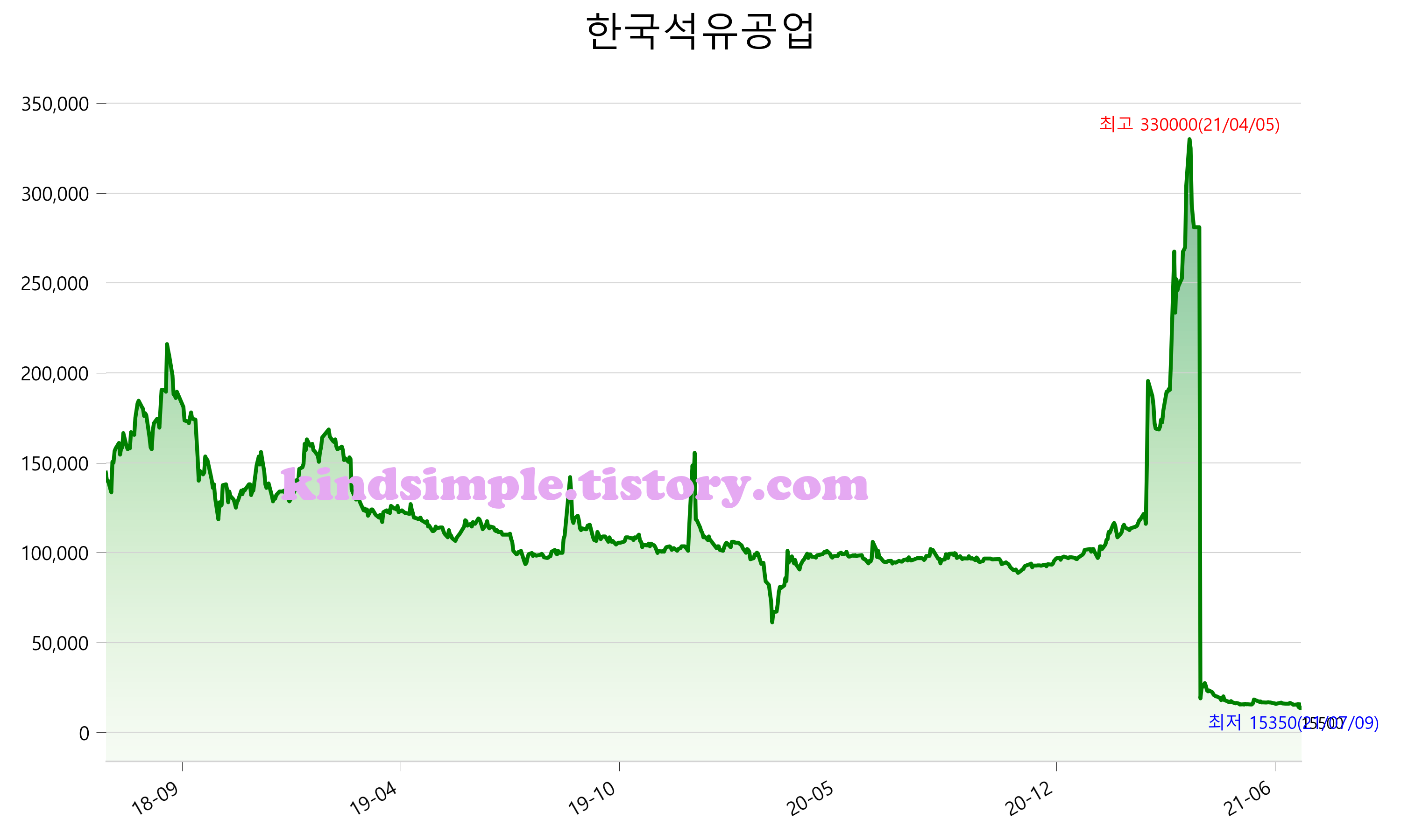 52주 최고가는 330,000원(2021-04-05), 52주 최저가는 15,350원(2021-07-09)으로 52주간 변동률은 -83.8% 입니다.