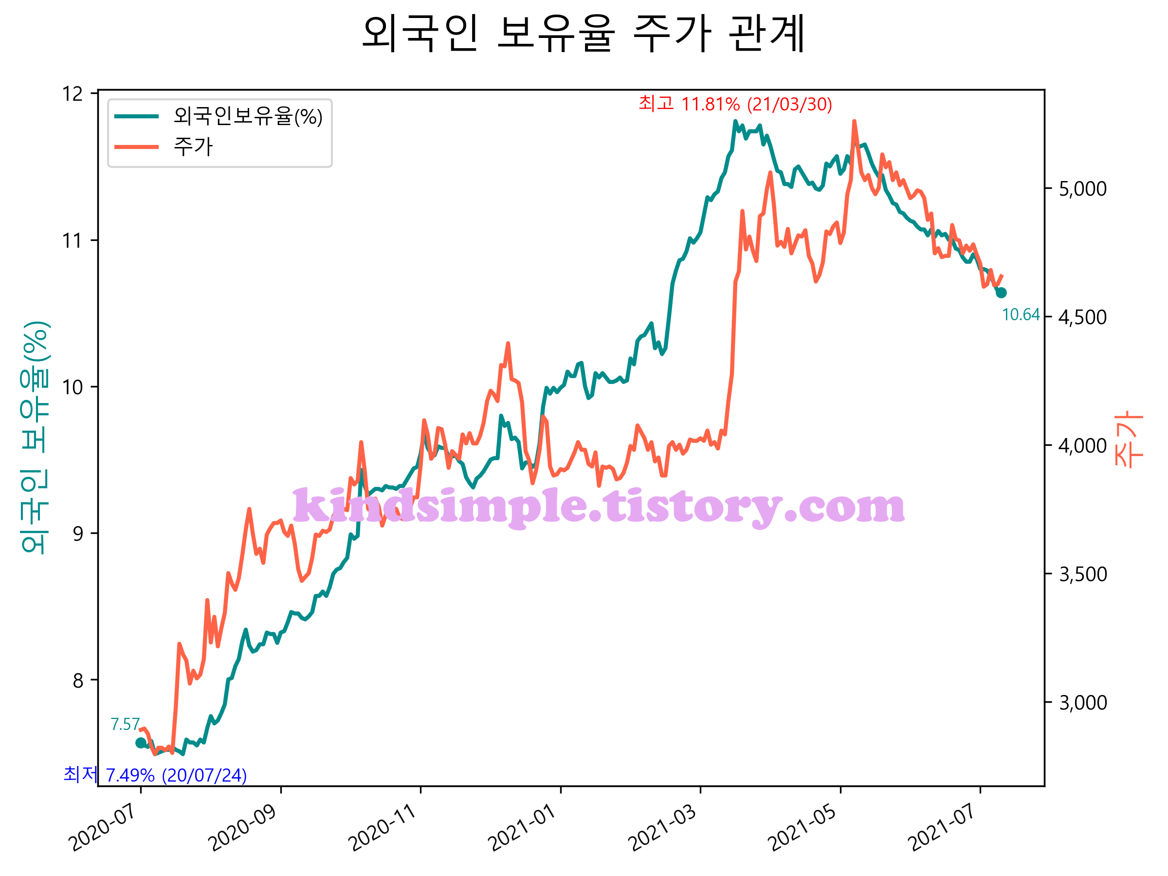 최근 1년간 외국인 보유율 및 주가와의 관계입니다.