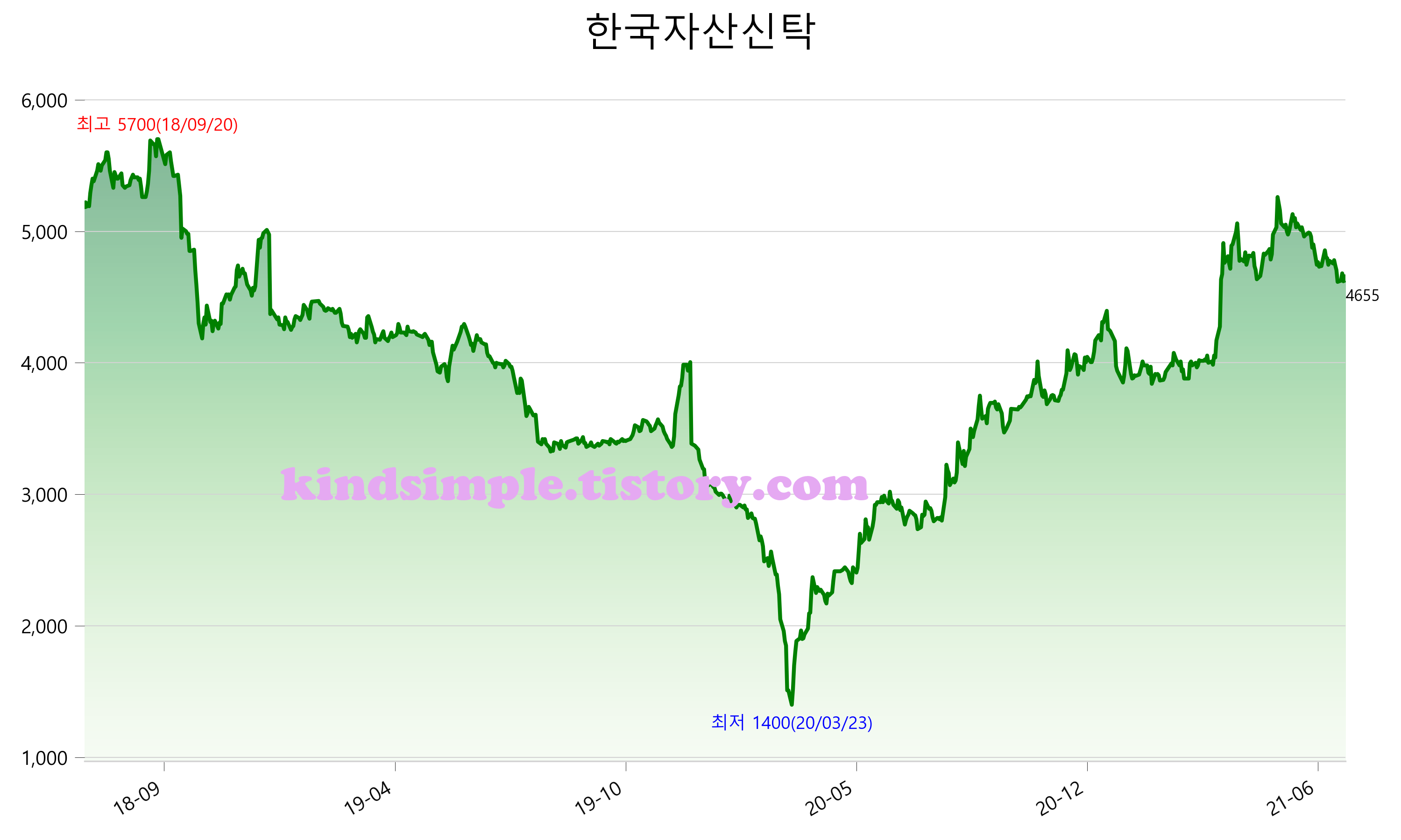 7월 17일 기준 주가는 4,655원 입니다. 아래는 최근 3년간의 주가흐름입니다.