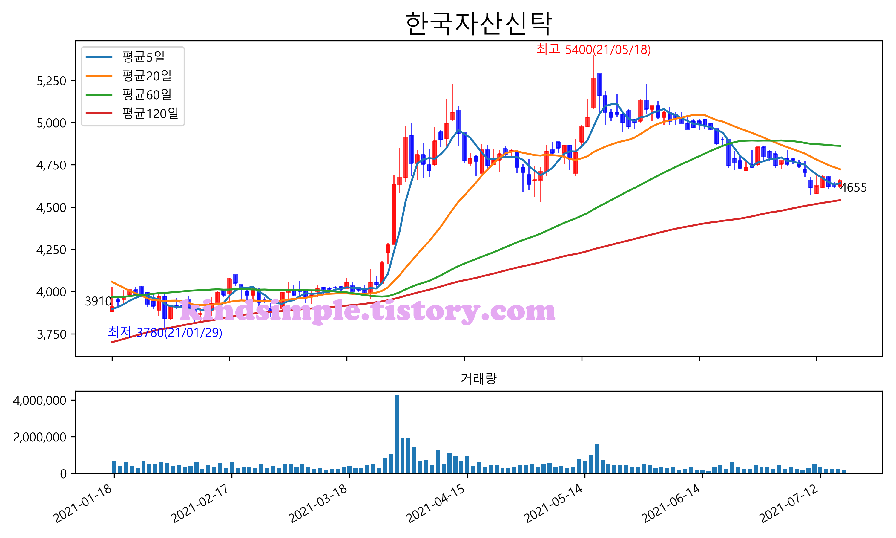 최근 6개월간 캔들차트 및 이동평균선입니다.