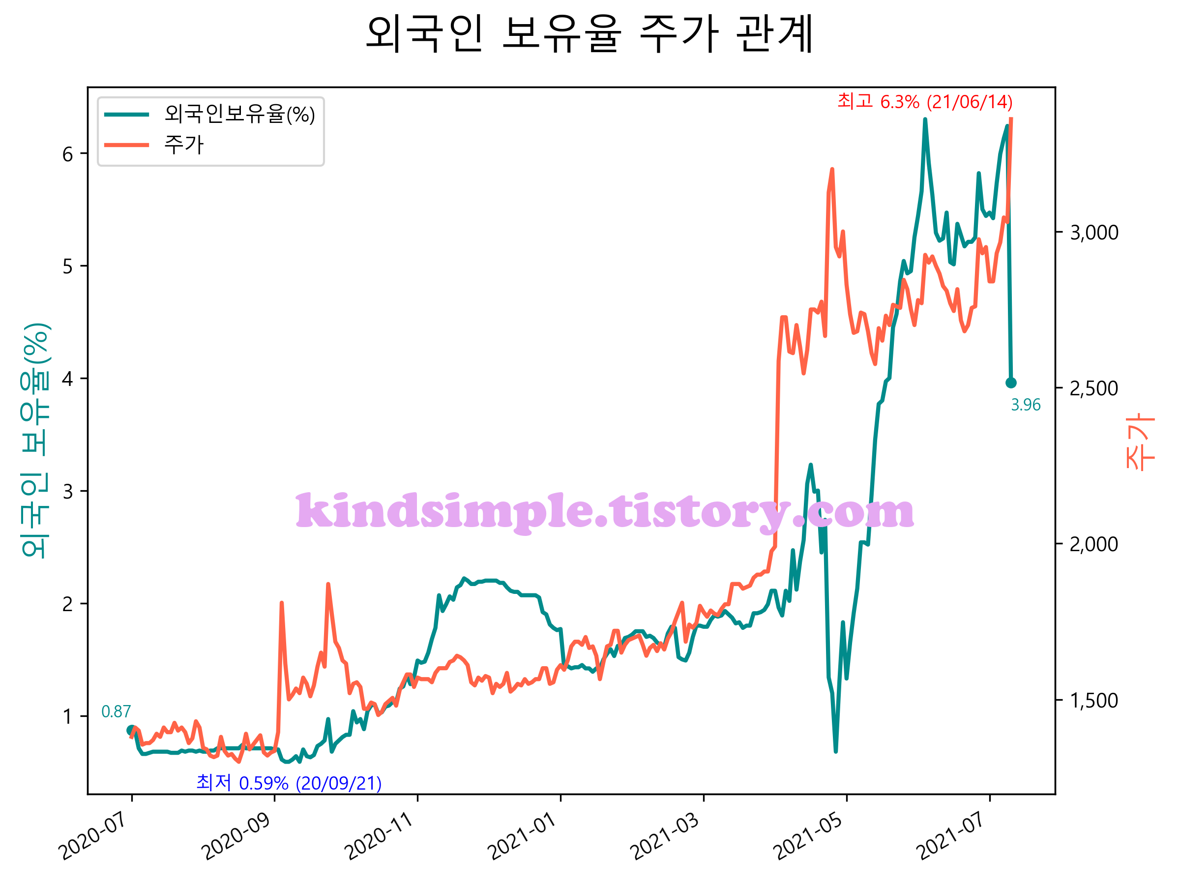 최근 1년간 외국인 보유율 및 주가와의 관계입니다.