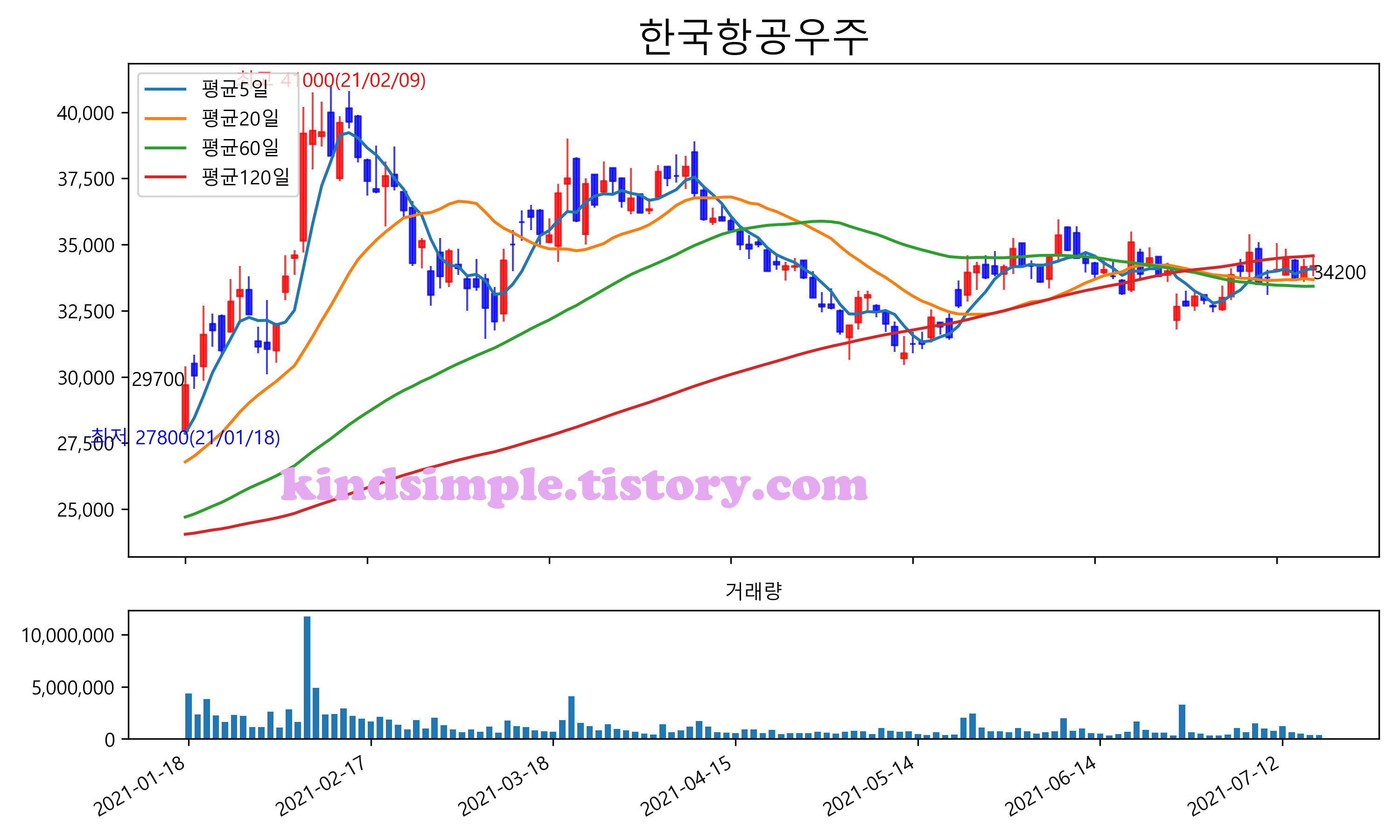 최근 6개월간 캔들차트 및 이동평균선입니다.