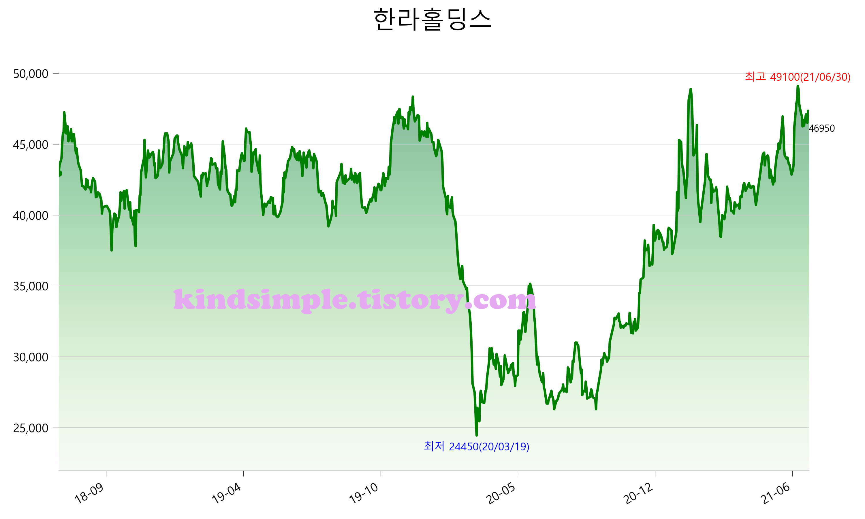 7월 17일 기준 주가는 46,950원 입니다. 아래는 최근 3년간의 주가흐름입니다.