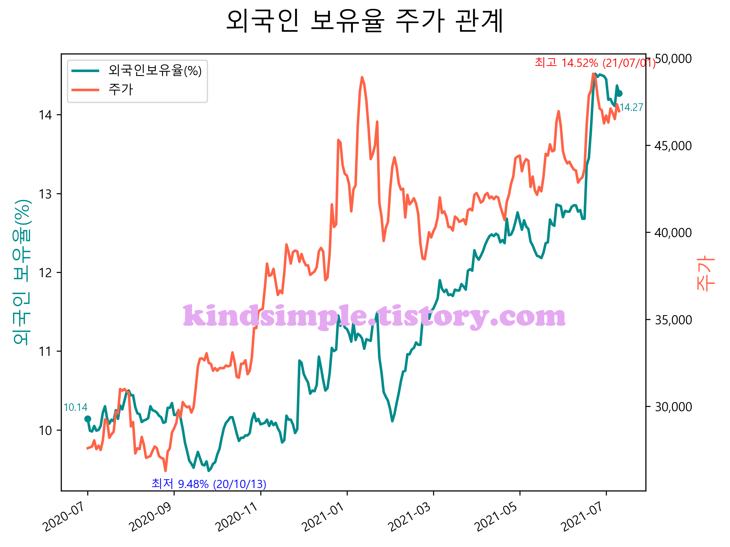 최근 1년간 외국인 보유율 및 주가와의 관계입니다.