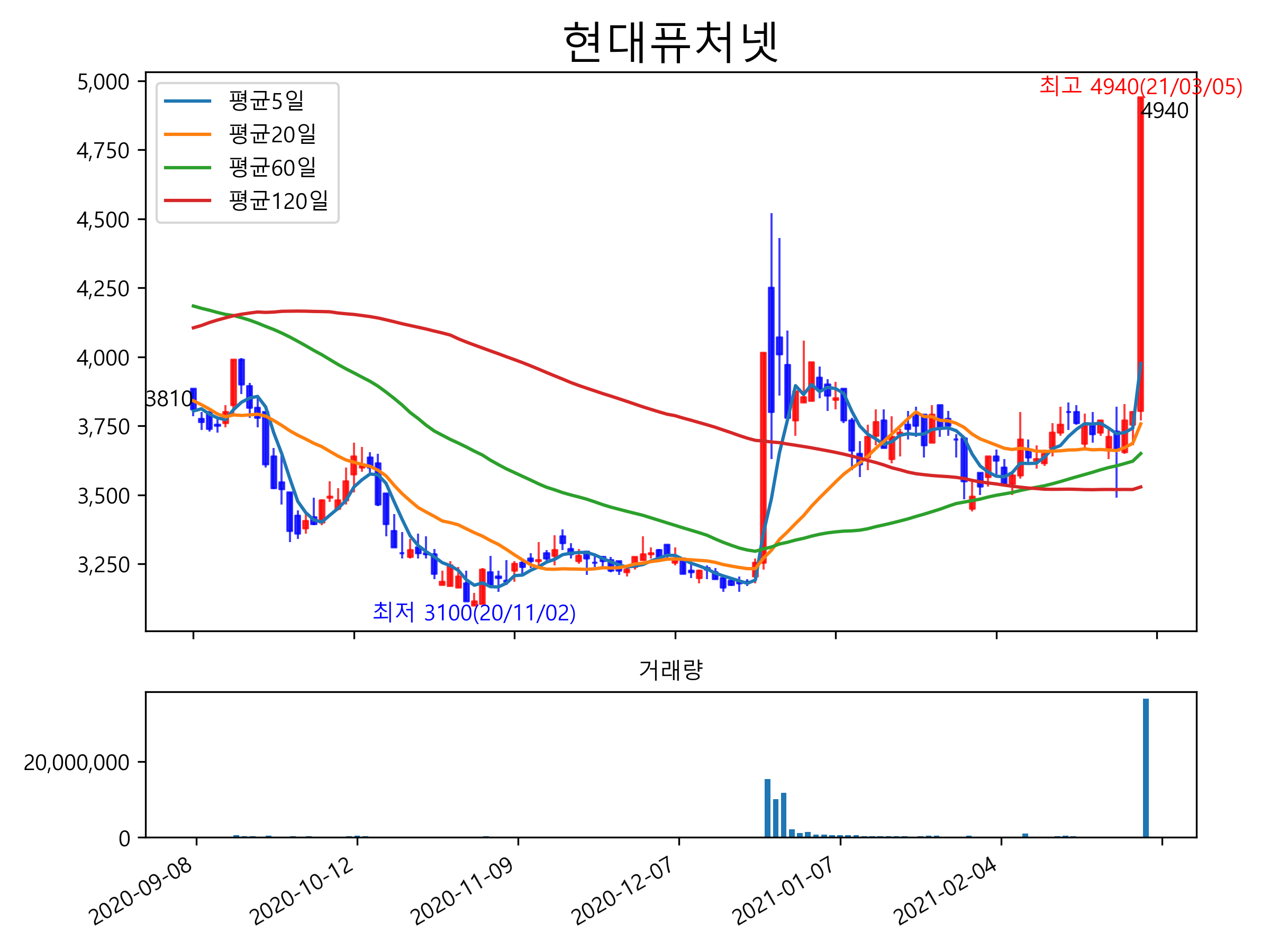 최근 6개월간 캔들차트 및 이동평균선입니다.