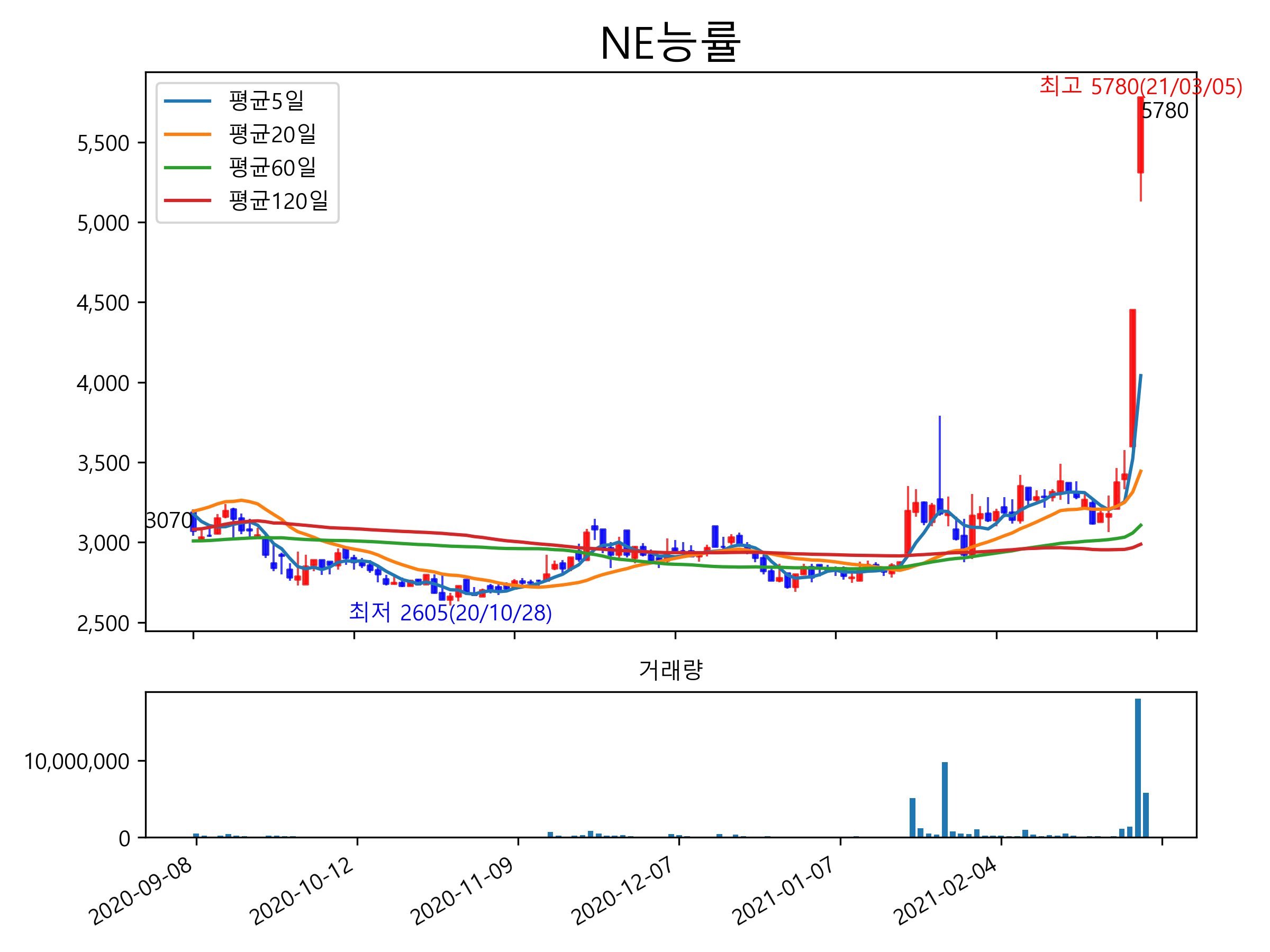 최근 6개월간 캔들차트 및 이동평균선입니다.