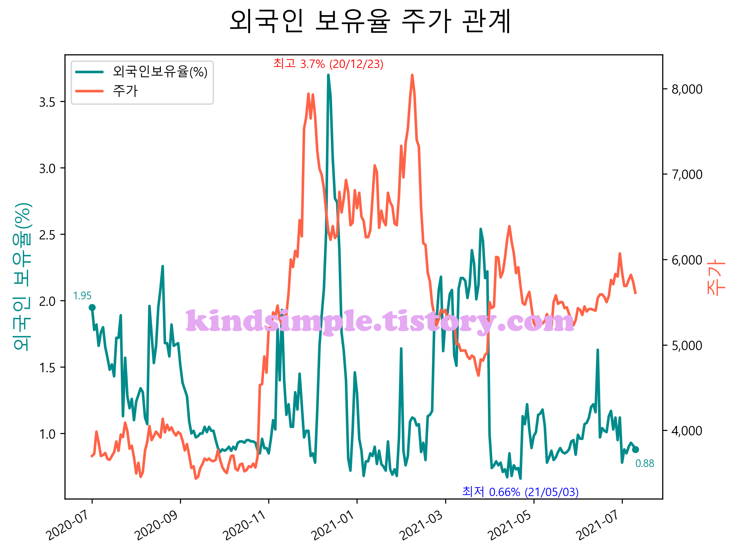 최근 1년간 외국인 보유율 및 주가와의 관계입니다.