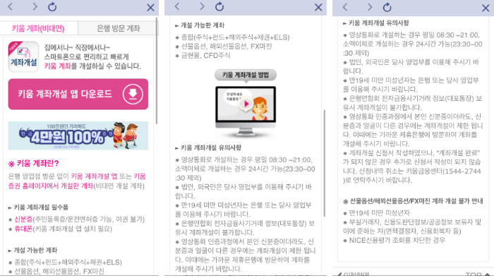 - 법인,외국인,재외국민은 비대면개설이 불가하며 당사 영업부를 이용해 주시기 바랍니다.(외국인,재외국민은 위탁/수익증권 상품만 가능)