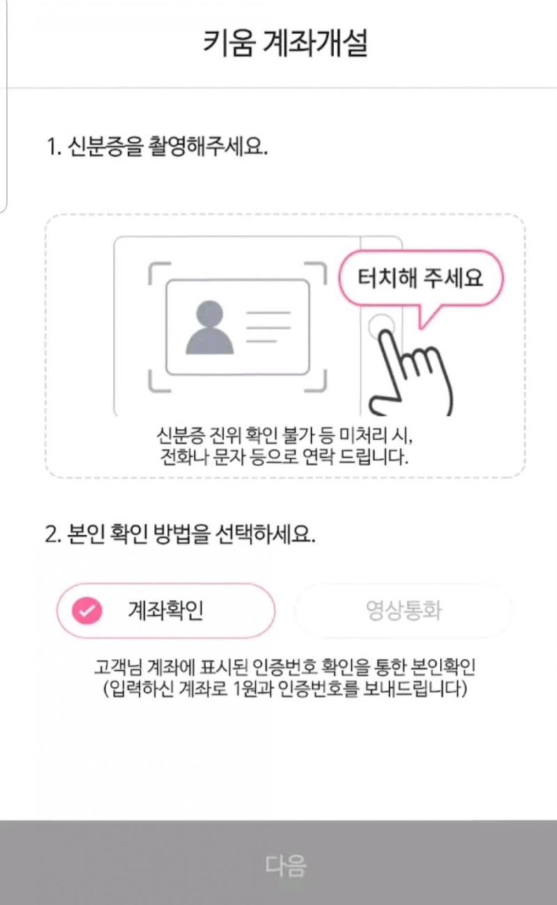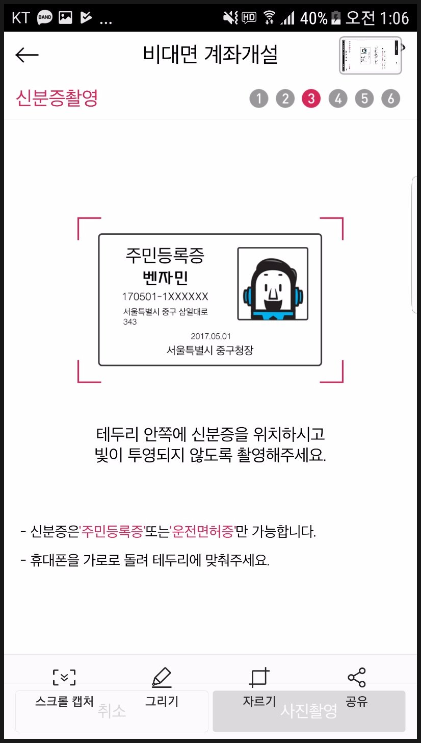 신분증을 촬영하게 됩니다. 빛이 반사가 안되는 곳에서 신분증 사진을 깔끔하게 찍으면 됩니다.